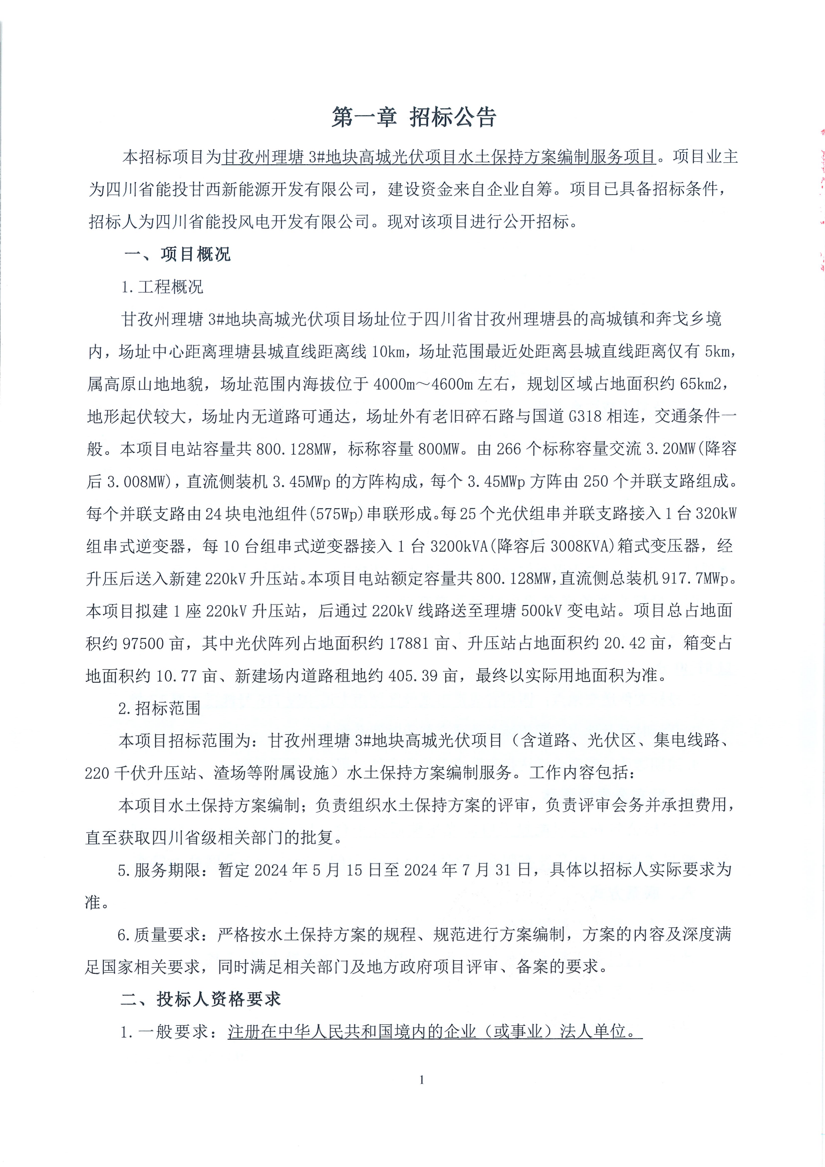 本项目招标范围为:甘孜州理塘3#地块高城光伏项目(含道路、光伏区、集电线路、220千伏升压站、渣场等附属设施)水土保持方案编制服务。工作内容包括: