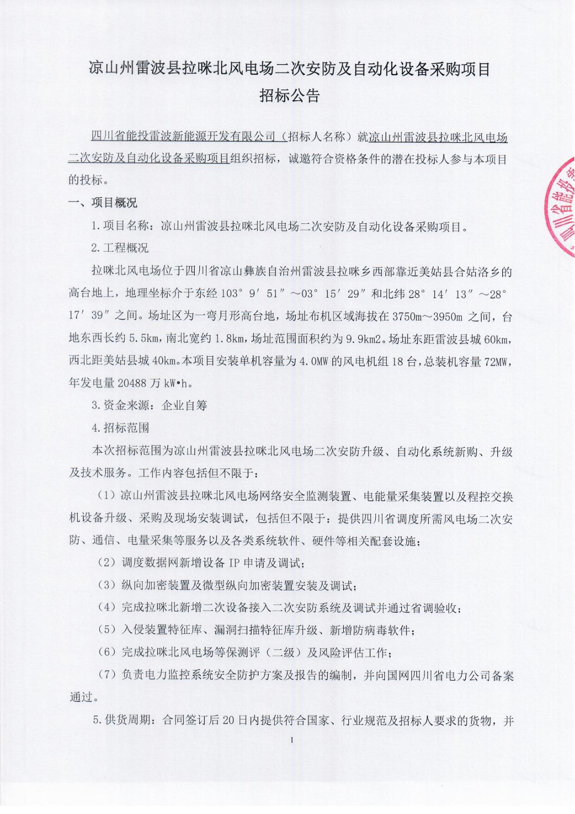 1.项目名称:凉山州雷波县拉咪北风电场二次安防及自动化设备采购项目。