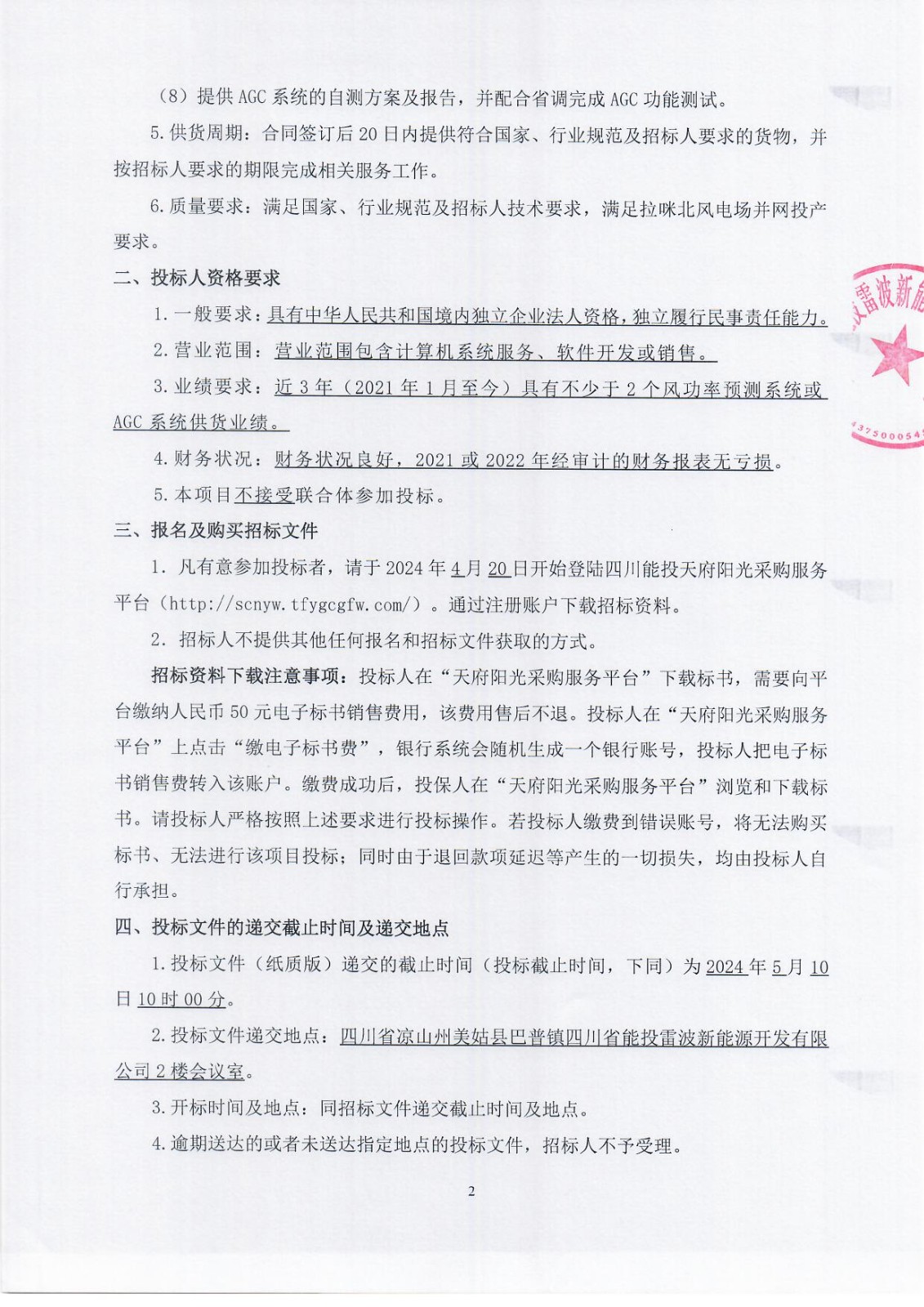 1.项目名称:凉山州雷波县拉咪北风电场风功率预测系统及AGC系统采购项目。