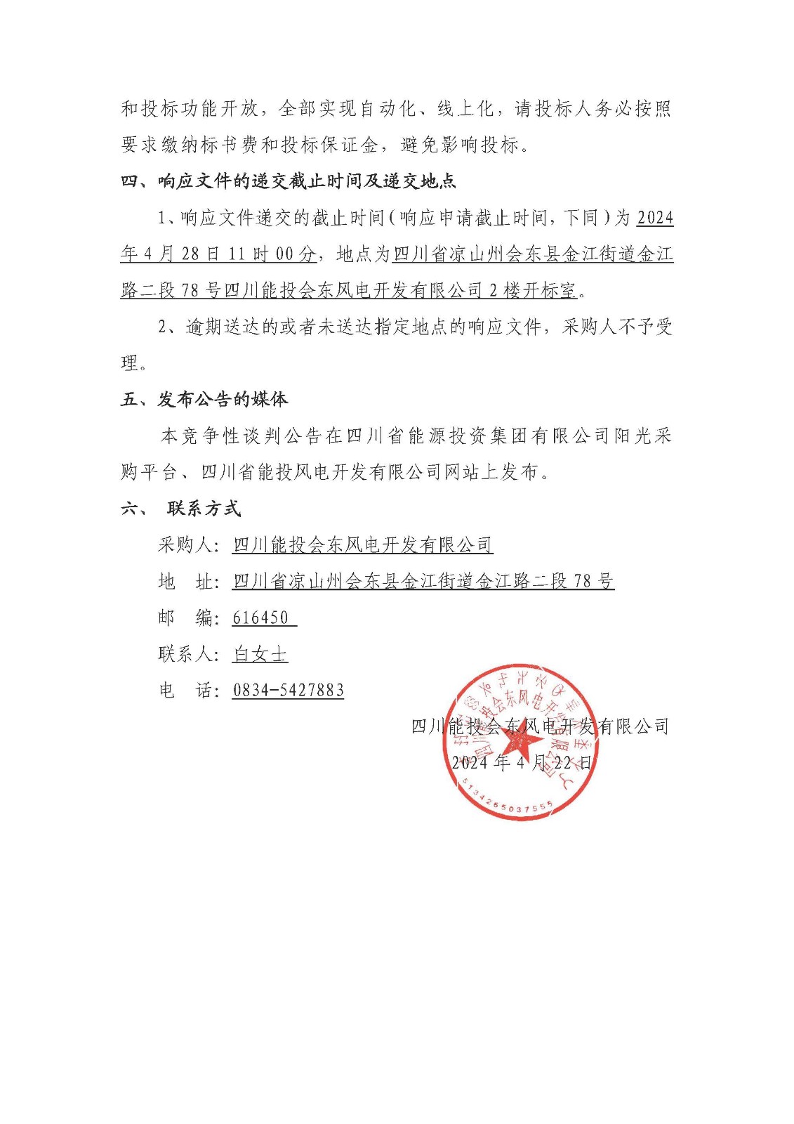 1、响应文件递交的截止时间(响应申请截止时间,下同)为2024年4月28日11时00分,地点为四川省凉山州会东县金江街道金江路二段78号四川能投会东风电开发有限公司2楼开标室。
