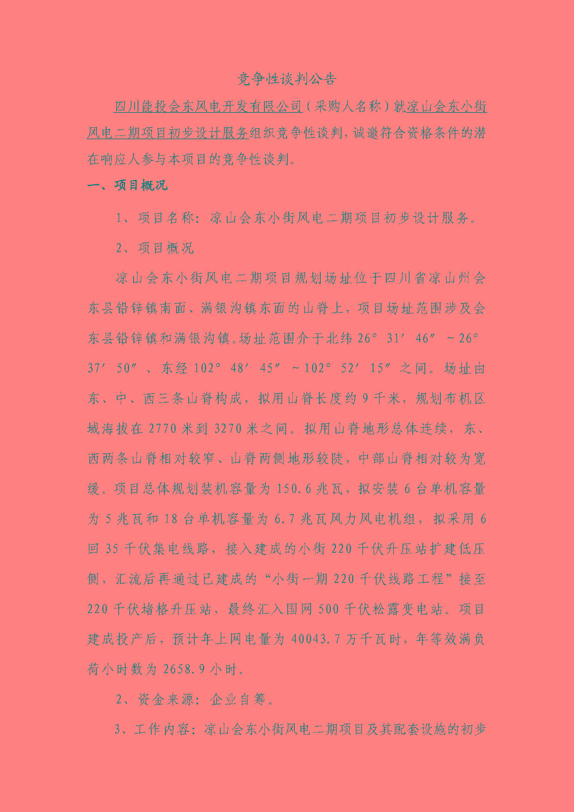 1、项目名称:凉山会东小街风电二期项目初步设计服务。