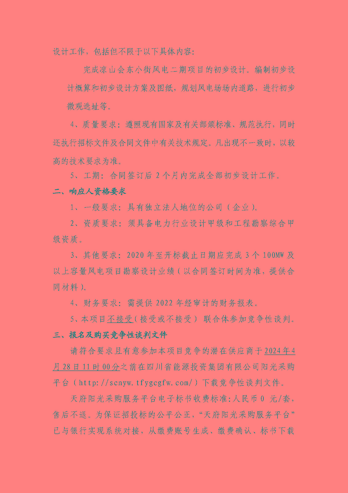 请符合要求且有意参加本项目竞争的潜在供应商于2024年4月28日11时00分之前在四川省能源投资集团有限公司阳光采购平台(http://scnyw.tfygcgfw.com/)下载竞争性谈判文件。