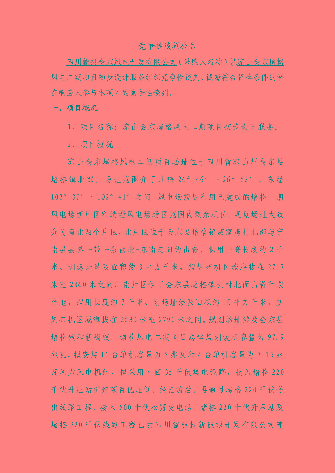 四川能投会东风电开发有限公司(采购人名称)就凉山会东堵格风电二期项目初步设计服务组织竞争性谈判,诚邀符合资格条件的潜在响应人参与本项目的竞争性谈判。