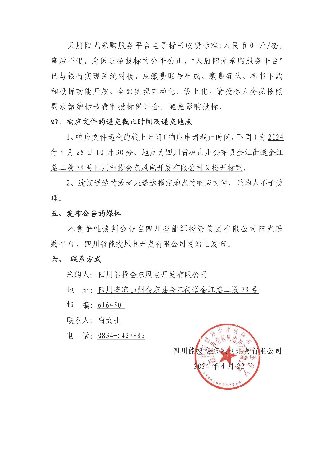 1、响应文件递交的截止时间(响应申请截止时间,下同)为2024年4月28日10时30分,地点为四川省凉山州会东县金江街道金江路二段78号四川能投会东风电开发有限公司2楼开标室。