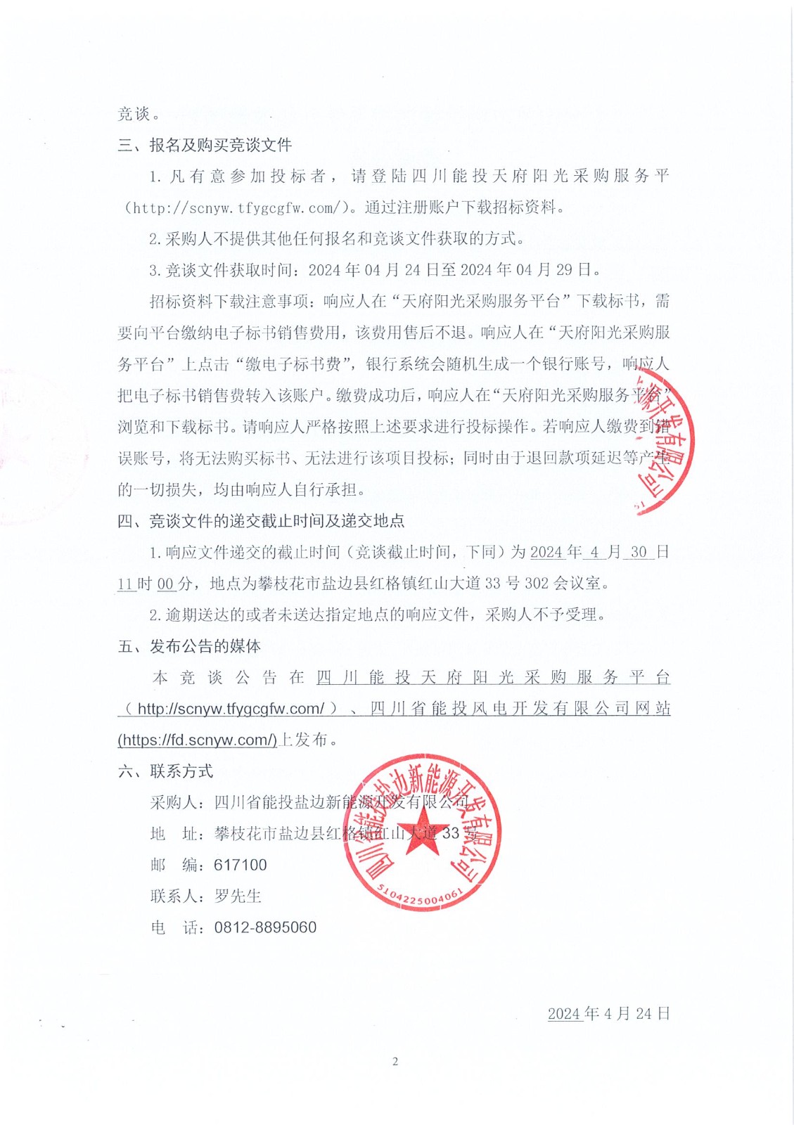 1.响应文件递交的截止时间(竞谈截止时间,下同)为2024年 4 月 30 日11时00分,地点为攀枝花市盐边县红格镇红山大道33号302会议室。
