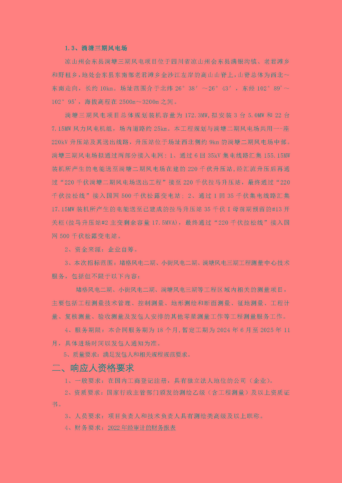 四川能投会东风电开发有限公司(采购人名称)就凉山会东堵格风电二期、小街风电二期、淌塘风电三期工程测量中心技术服务项目组织竞争性谈判,诚邀符合资格条件的潜在响应人参与本项目的竞争性谈判。