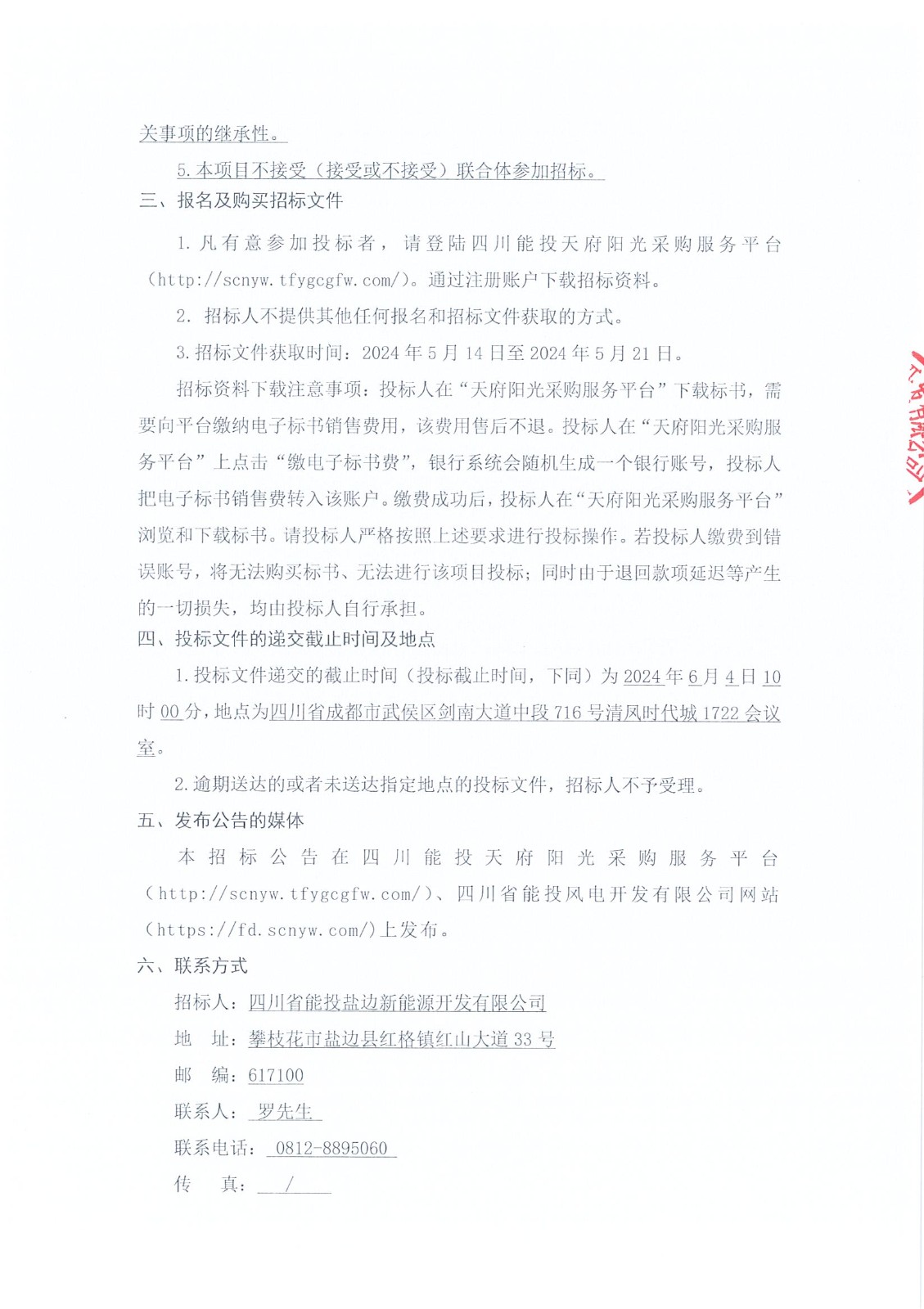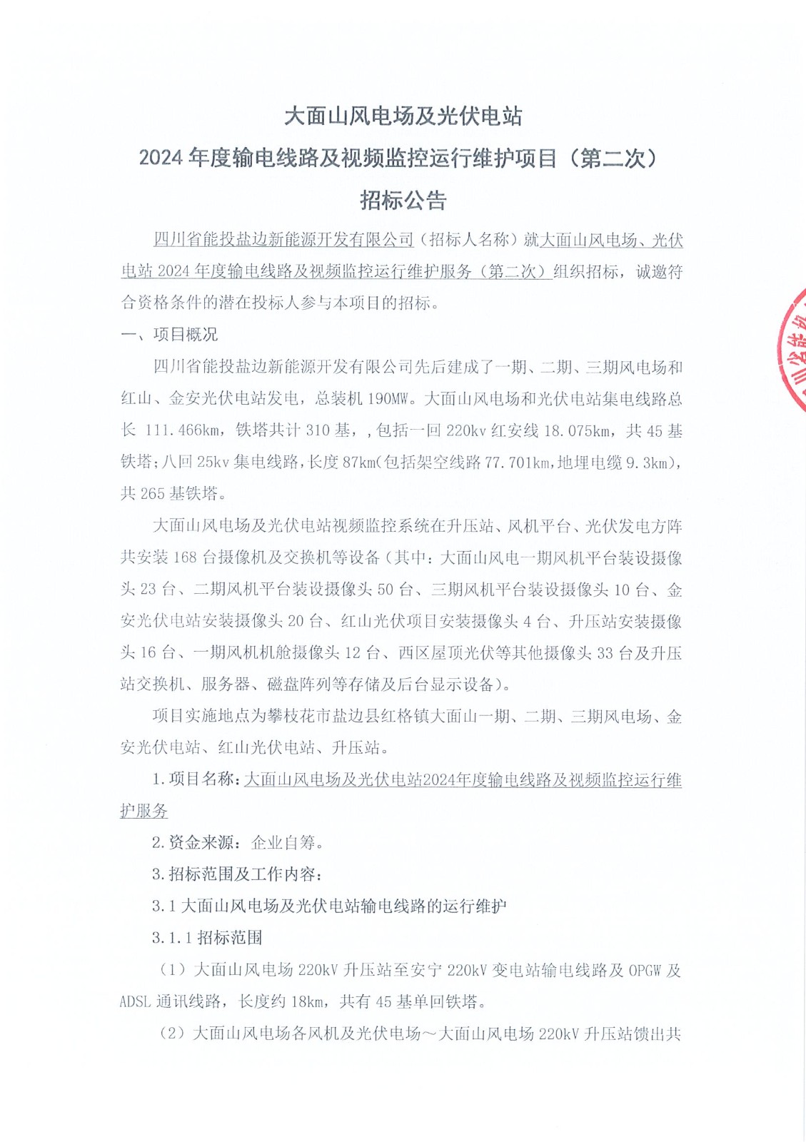 四川省能投盐边新能源开发有限公司(招标人名称)就大面山风电场、光伏电站2024年度输电线路及视频监控运行维护服务(第二次)组织招标,诚邀符合资格条件的潜在投标人参与本项目的招标。