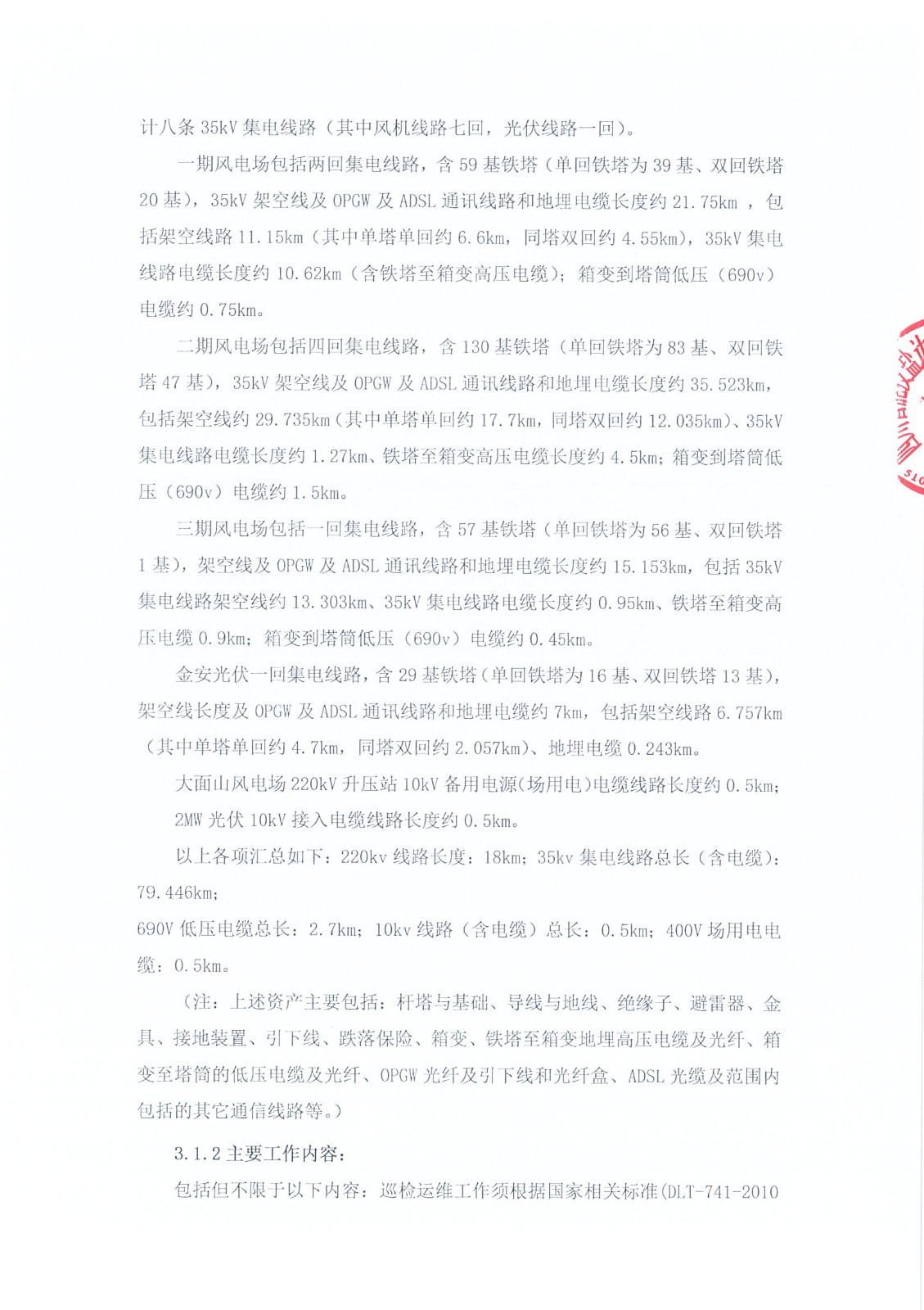 (注:上述资产主要包括:杆塔与基础、导线与地线、绝缘子、避雷器、金具、接地装置、引下线、跌落保险、箱变、铁塔至箱变地埋高压电缆及光纤、箱变至塔筒的低压电缆及光纤、OPGW光纤及引下线和光纤盒、ADSL光缆及范围内包括的其它通信线路等。)