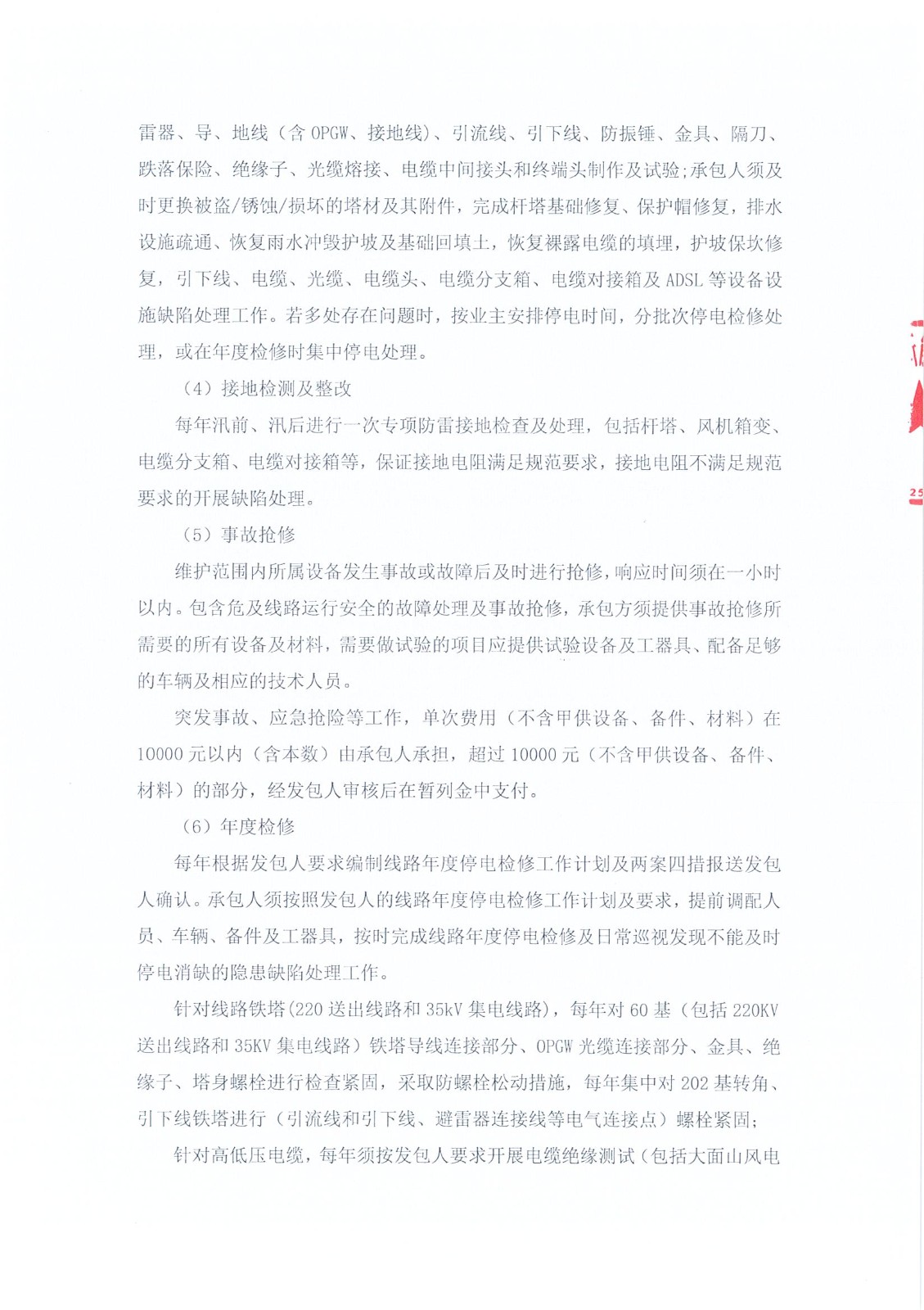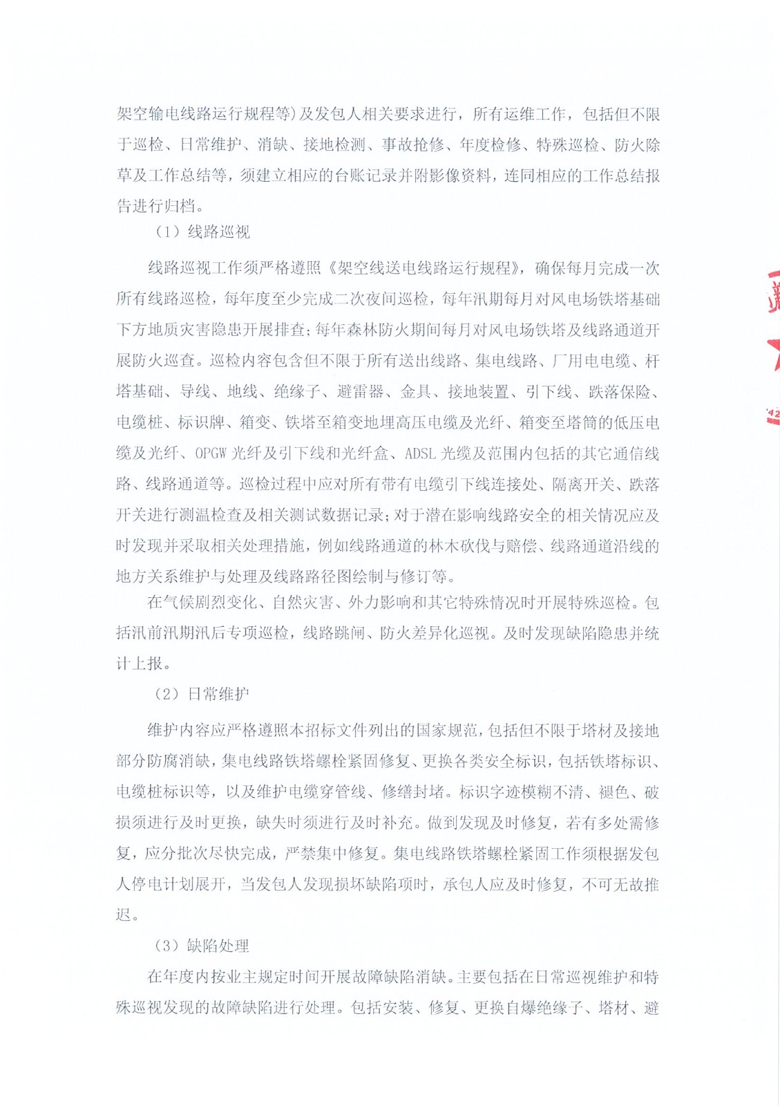 2.资质要求:输电线路运行维护要求具有电力工程施工总承包或输变电工程专业承包二级及以上资质,且具有中华人民共和国电力承(装、修)试二级及以上资质。