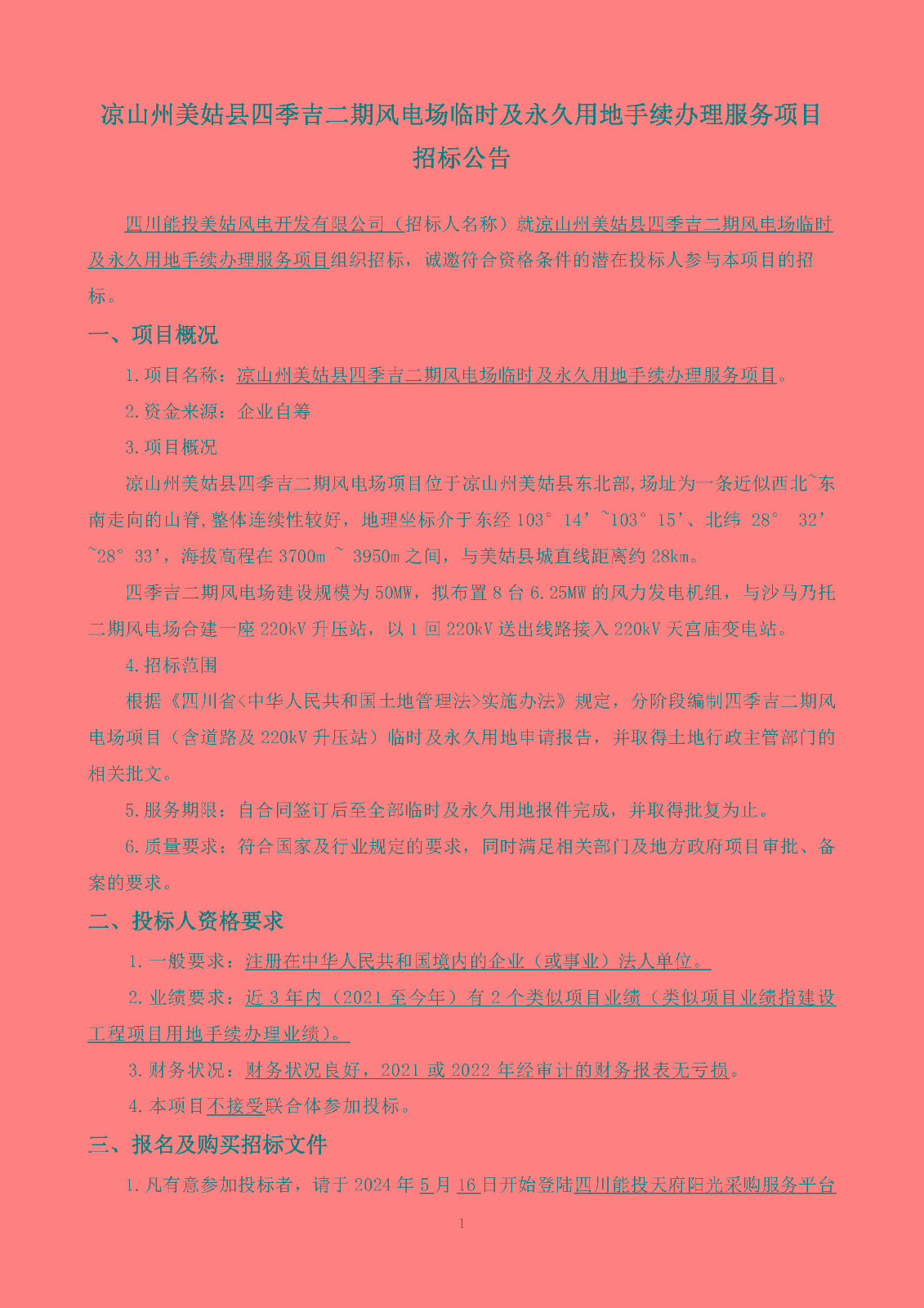 四川能投美姑风电开发有限公司(招标人名称)就凉山州美姑县四季吉二期风电场临时及永久用地手续办理服务项目组织招标,诚邀符合资格条件的潜在投标人参与本项目的招标。