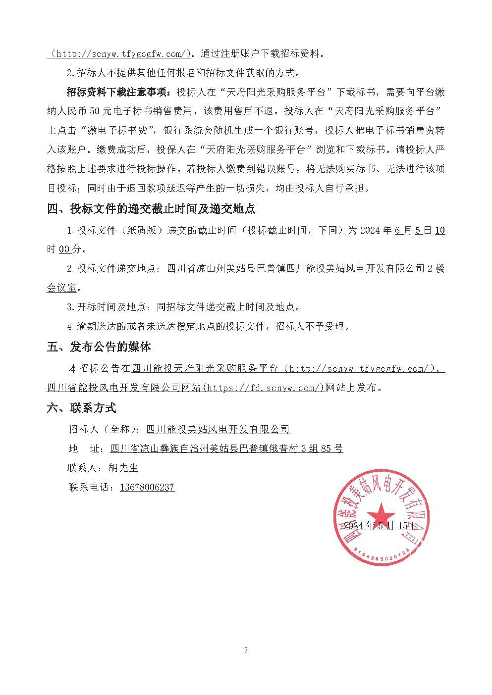 2.投标文件递交地点:四川省凉山州美姑县巴普镇四川能投美姑风电开发有限公司2楼会议室。