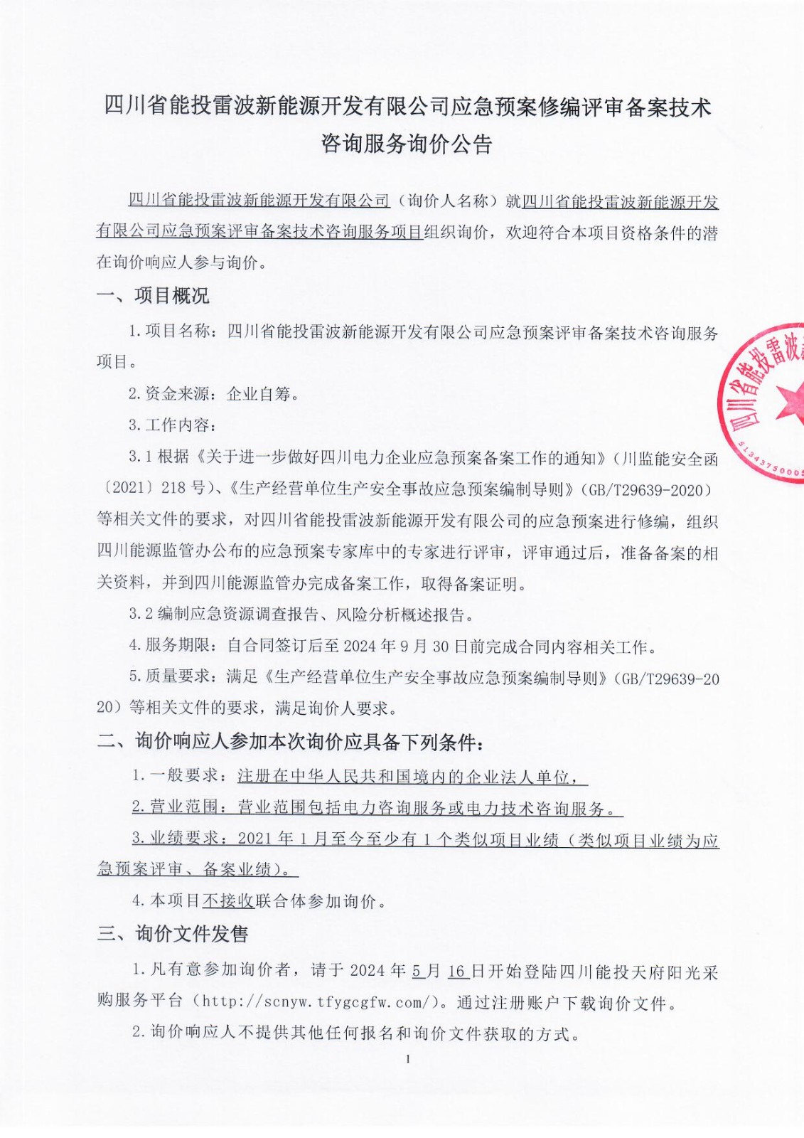 四川省能投雷波新能源开发有限公司(询价人名称)就四川省能投雷波新能源开发有限公司应急预案评审备案技术咨询服务项目组织询价,欢迎符合本项目资格条件的潜在询价响应人参与询价。