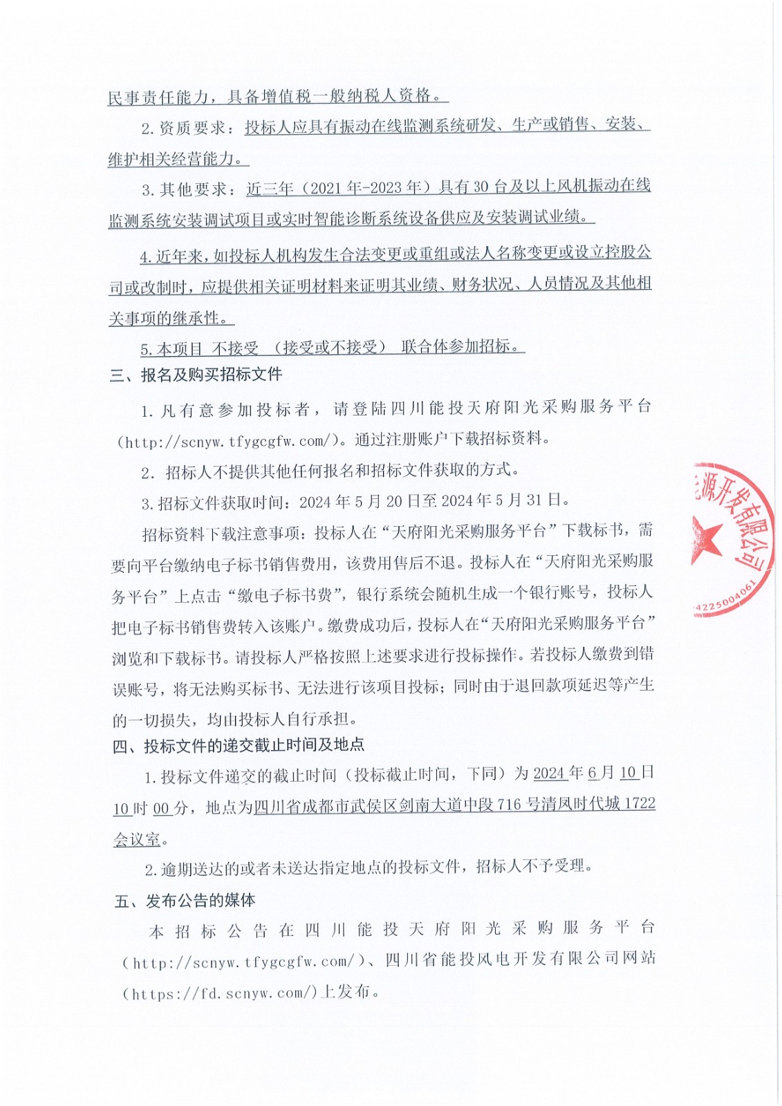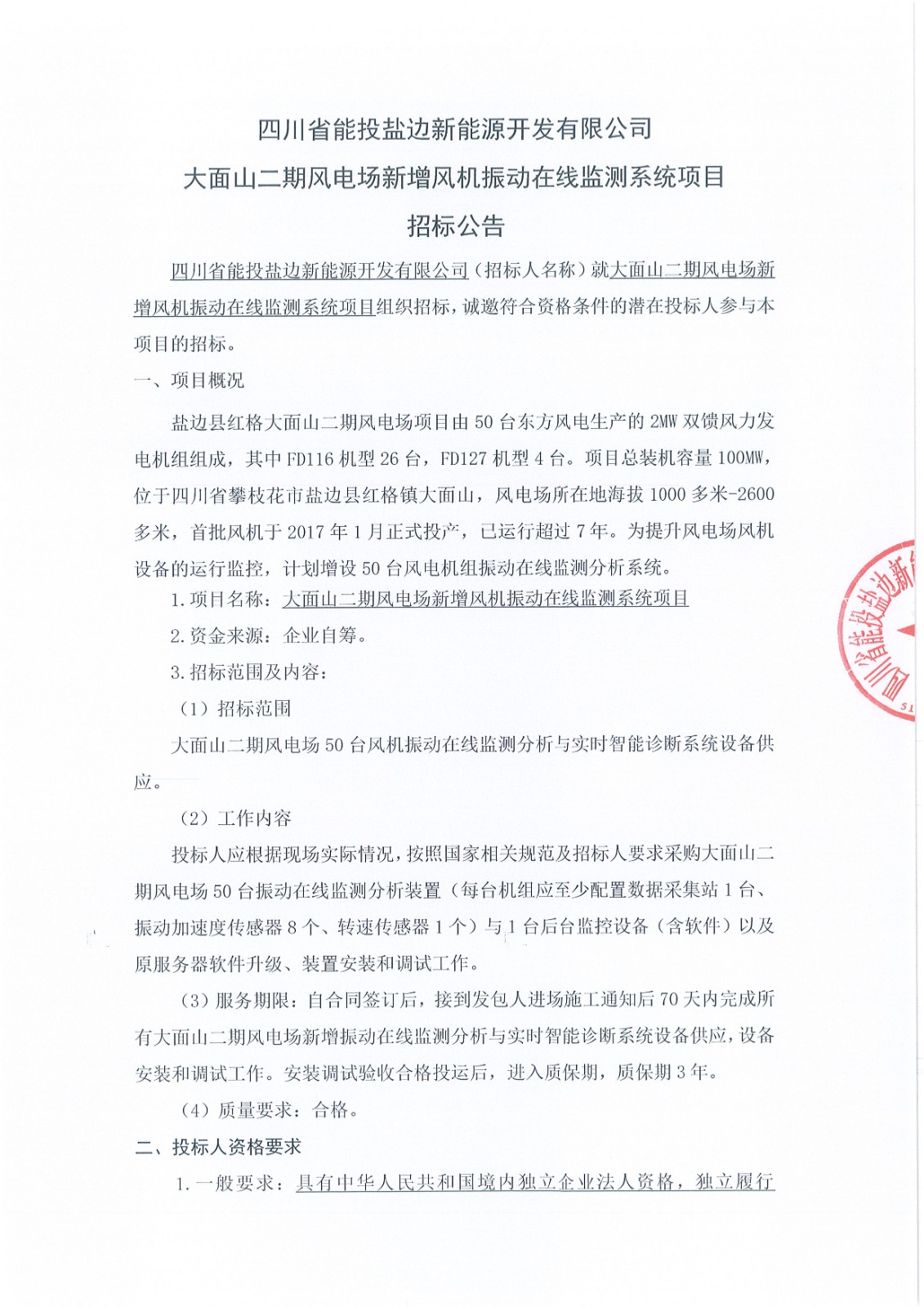 四川省能投盐边新能源开发有限公司(招标人名称)就大面山二期风电场新增风机振动在线监测系统项目组织招标,诚邀符合资格条件的潜在投标人参与本项目的招标。
