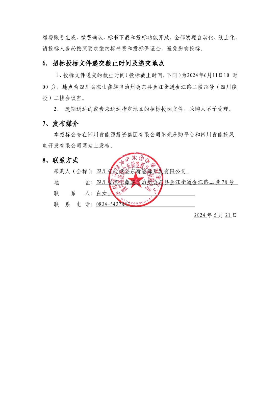 1、投标文件递交的截止时间(投标截止时间,下同)为2024年6月11日10 时 00 分,地点为四川省凉山彝族自治州会东县金江街道金江路二段78号(四川能投)二楼会议室。