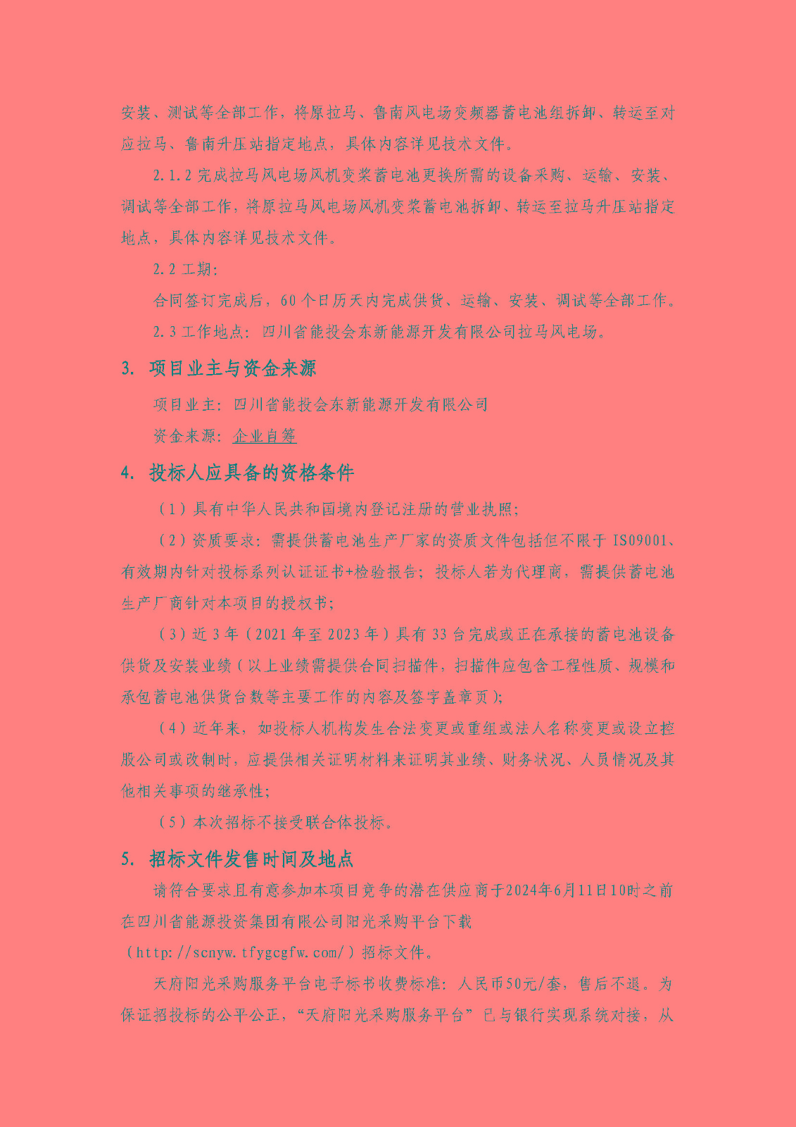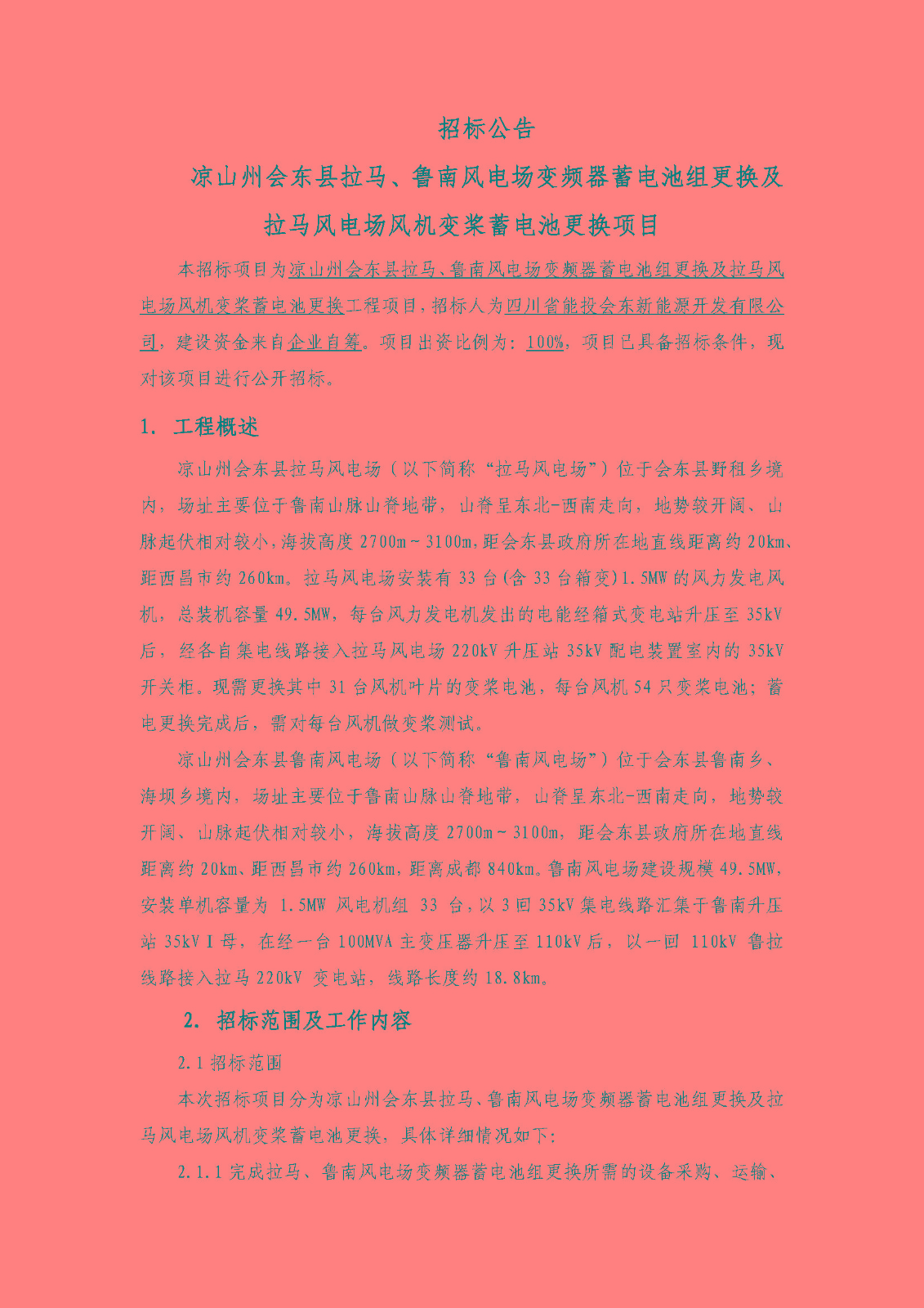 本招标项目为凉山州会东县拉马、鲁南风电场变频器蓄电池组更换及拉马风电场风机变桨蓄电池更换工程项目,招标人为四川省能投会东新能源开发有限公司,建设资金来自企业自筹。项目出资比例为:100%,项目已具备招标条件,现对该项目进行公开招标。