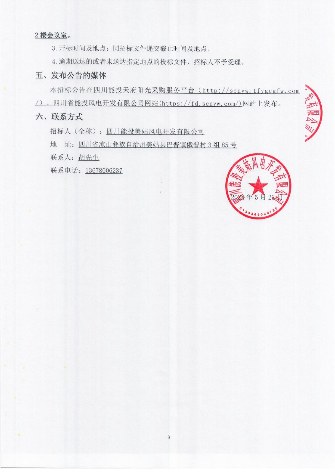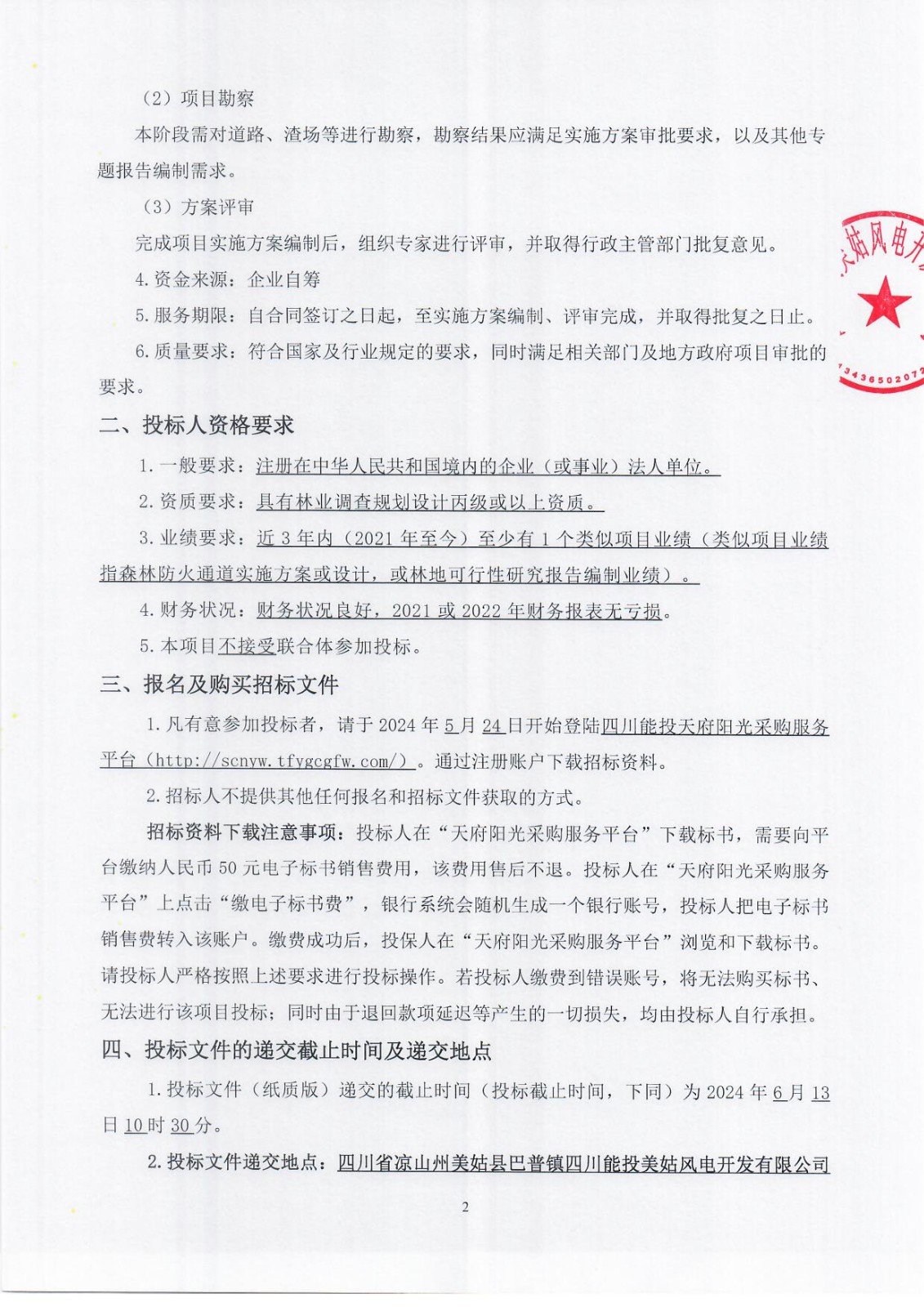 2.投标文件递交地点:四川省凉山州美姑县巴普镇四川能投美姑风电开发有限公司2楼会议室。