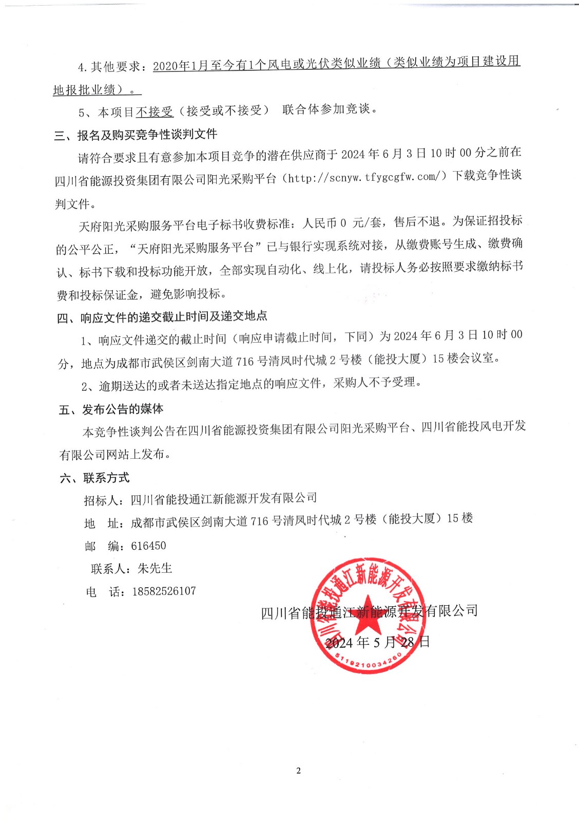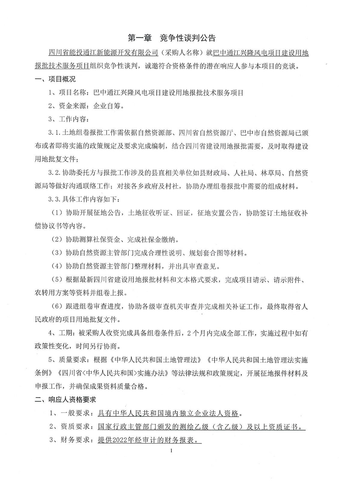 四川省能投通江新能源开发有限公司(采购人名称)就巴中通江兴隆风电项目建设用地报批技术服务项目组织竞争性谈判,诚邀符合资格条件的潜在响应人参与本项目的竞谈。