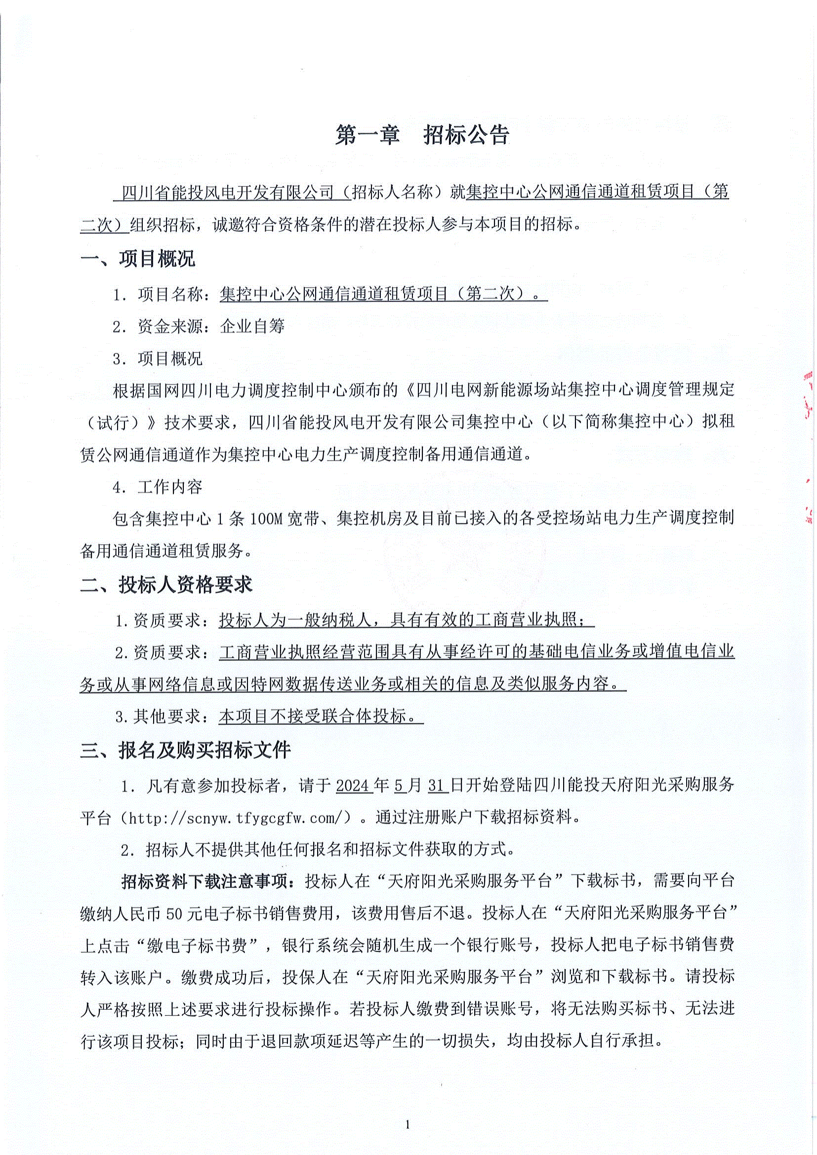 1.项目名称:集控中心公网通信通道租赁项目(第二次)。