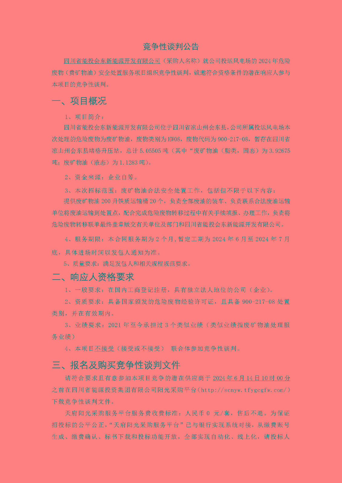 四川省能投会东新能源开发有限公司(采购人名称)就公司投运风电场的2024年危险废物(费矿物油)安全处置服务项目组织竞争性谈判,诚邀符合资格条件的潜在响应人参与本项目的竞争性谈判。