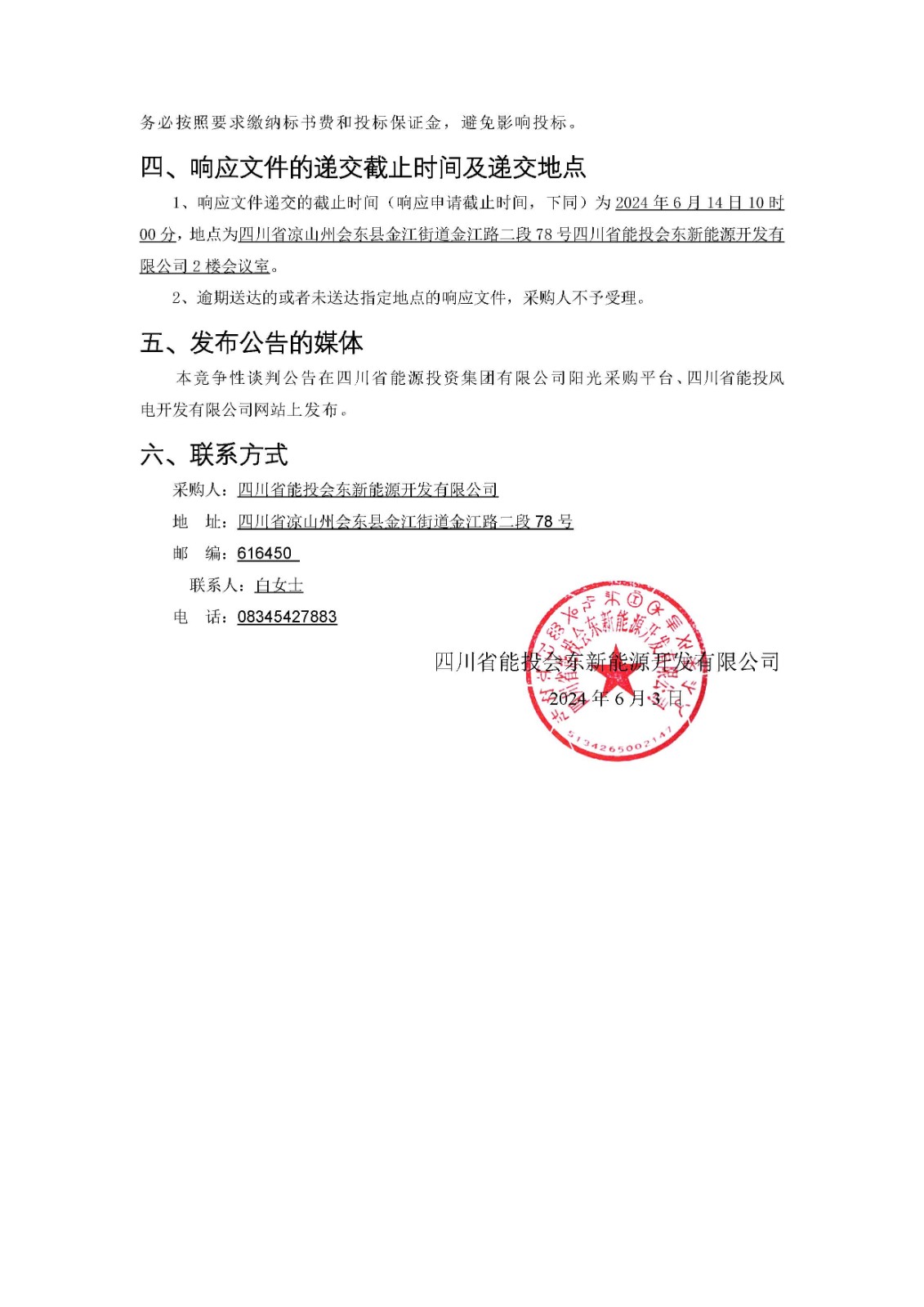 1、响应文件递交的截止时间(响应申请截止时间,下同)为2024年6月14日10时00分,地点为四川省凉山州会东县金江街道金江路二段78号四川省能投会东新能源开发有限公司2楼会议室。