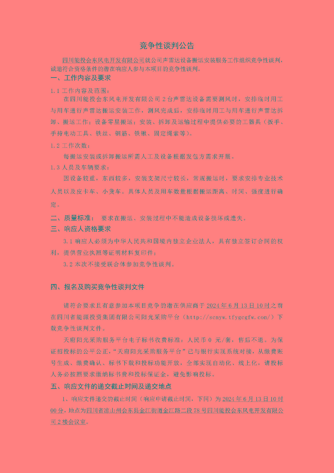 四川能投会东风电开发有限公司就公司声雷达设备搬运安装服务工作组织竞争性谈判,诚邀符合资格条件的潜在响应人参与本项目的竞争性谈判。