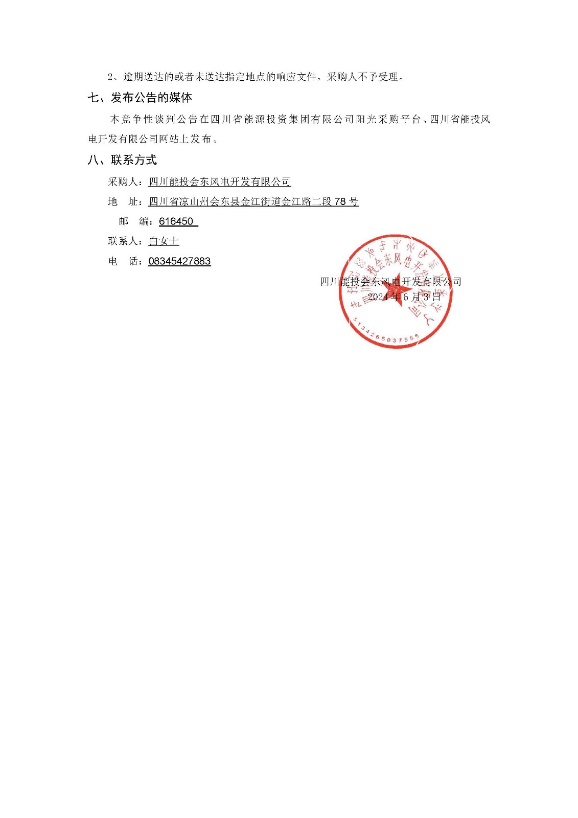 1、响应文件递交的截止时间(响应申请截止时间,下同)为2024年6月13日10时00分,地点为四川省凉山州会东县金江街道金江路二段78号四川能投会东风电开发有限公司2楼会议室。