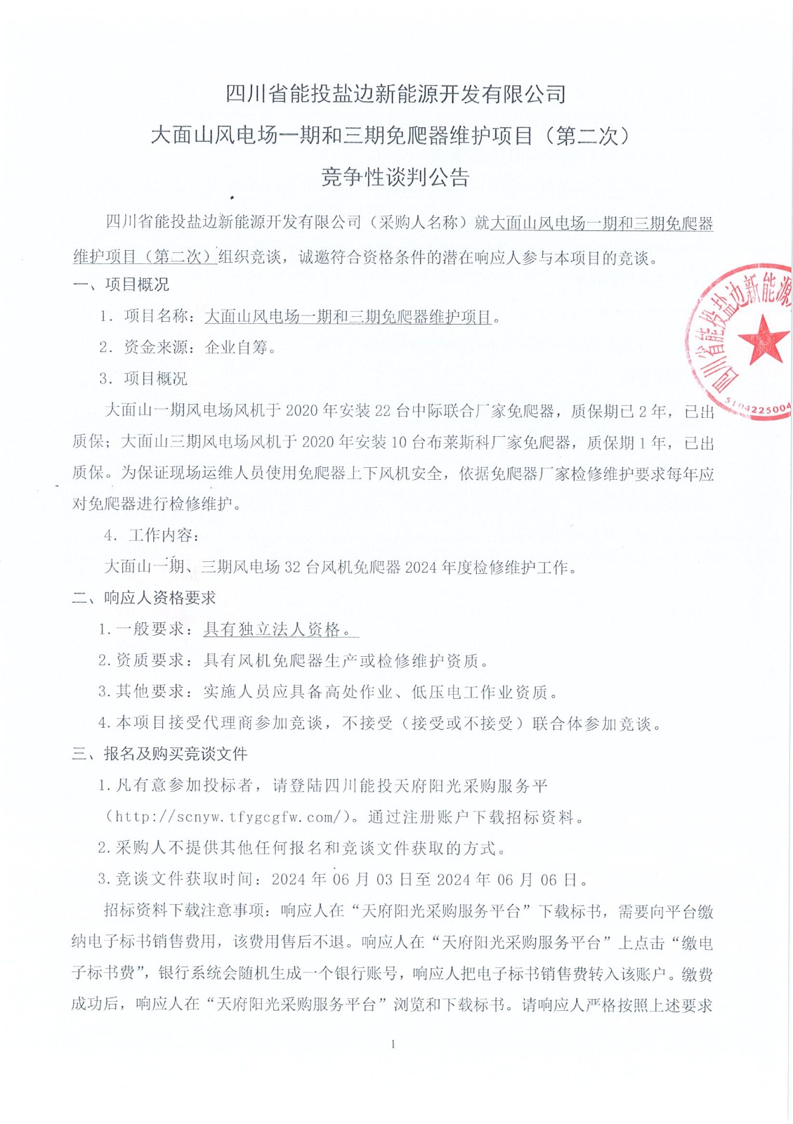 四川省能投盐边新能源开发有限公司(采购人名称)就大面山风电场一期和三期免爬器维护项目(第二次)组织竞谈,诚邀符合资格条件的潜在响应人参与本项目的竞谈。