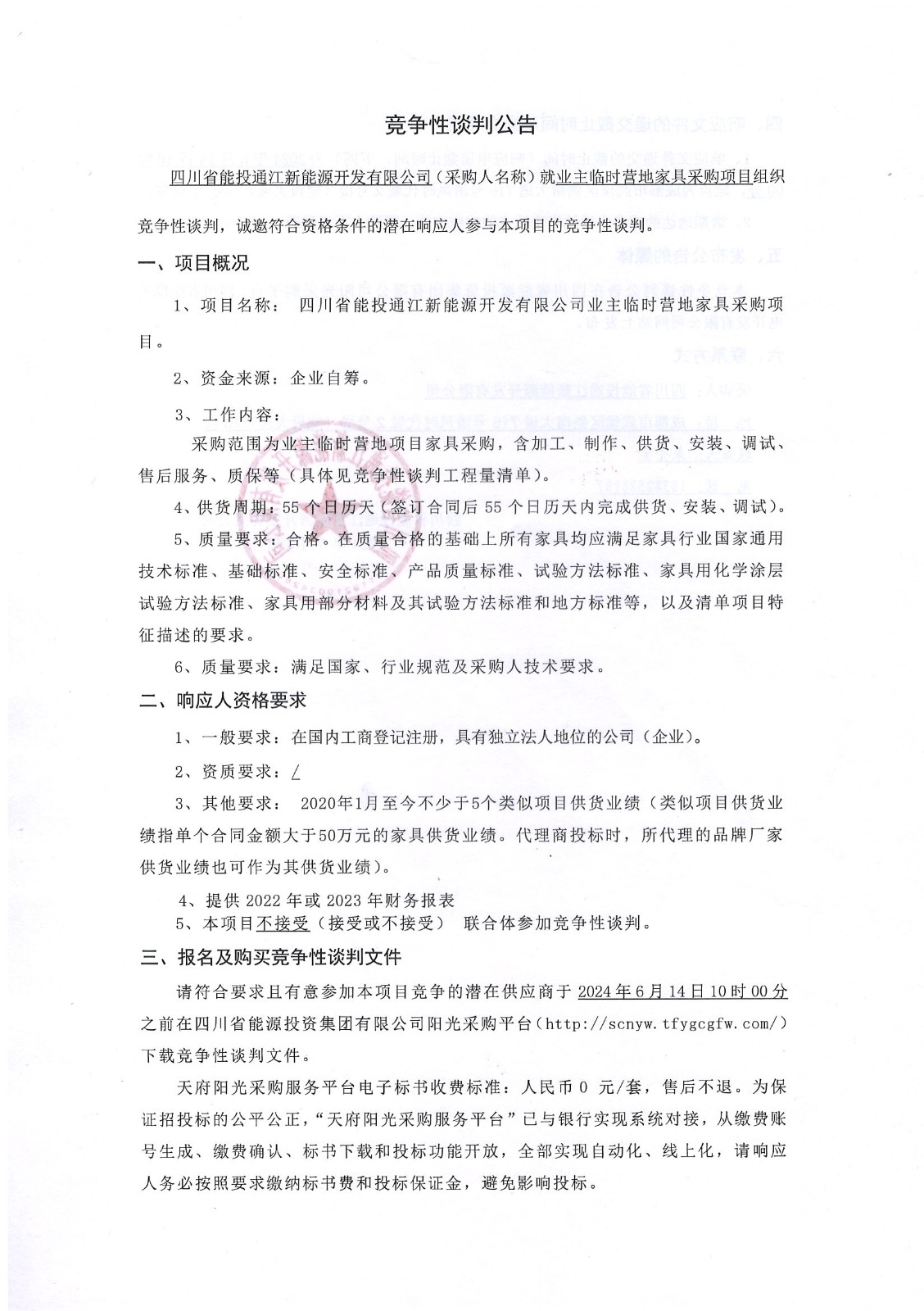 四川省能投通江新能源开发有限公司(采购人名称)就业主临时营地家具采购项目组织竞争性谈判,诚邀符合资格条件的潜在响应人参与本项目的竞争性谈判。