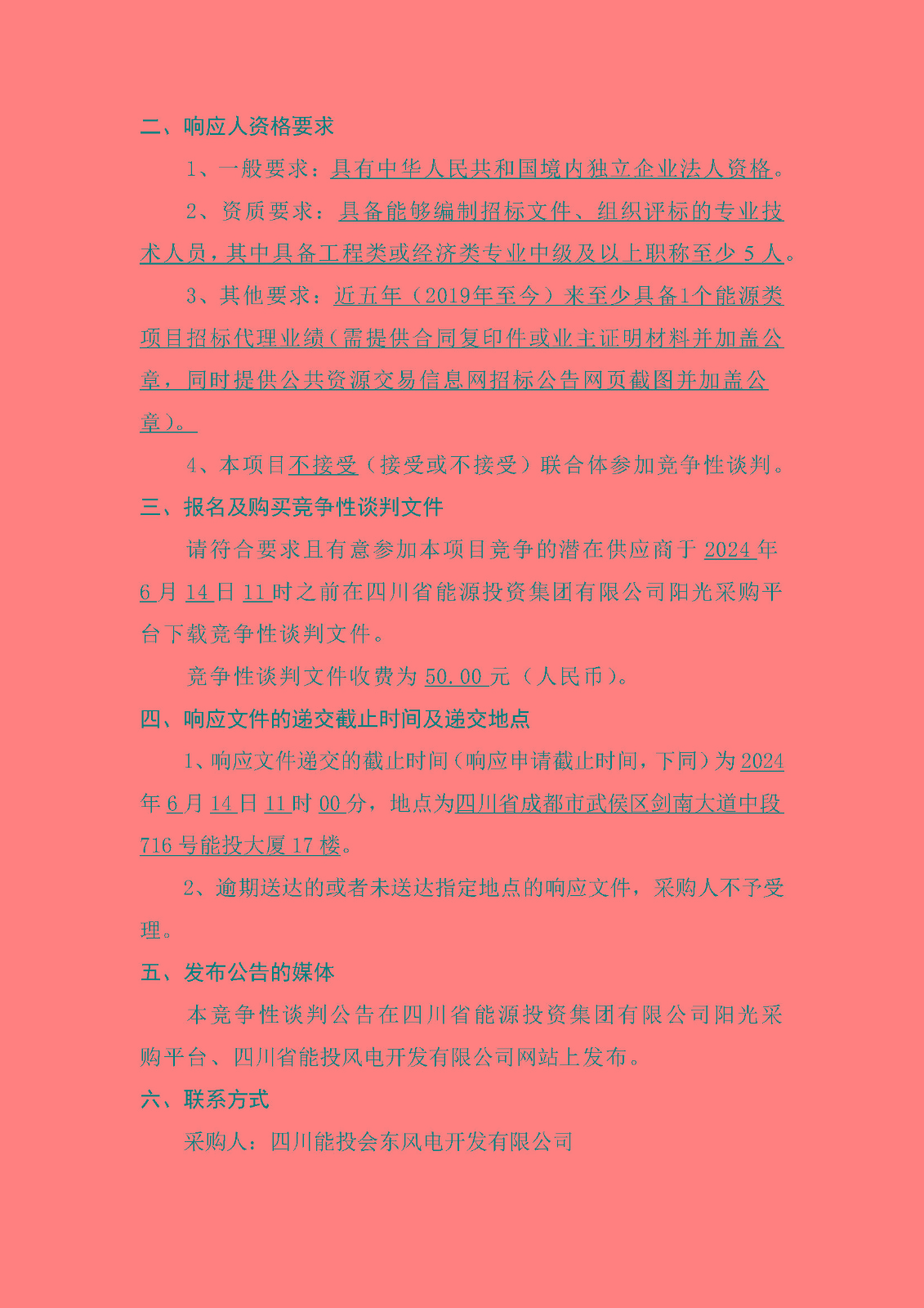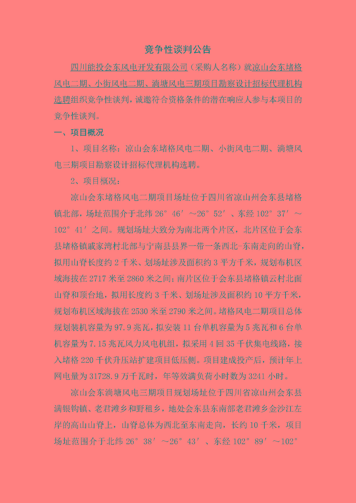 四川能投会东风电开发有限公司(采购人名称)就凉山会东堵格风电二期、小街风电二期、淌塘风电三期项目勘察设计招标代理机构选聘组织竞争性谈判,诚邀符合资格条件的潜在响应人参与本项目的竞争性谈判。