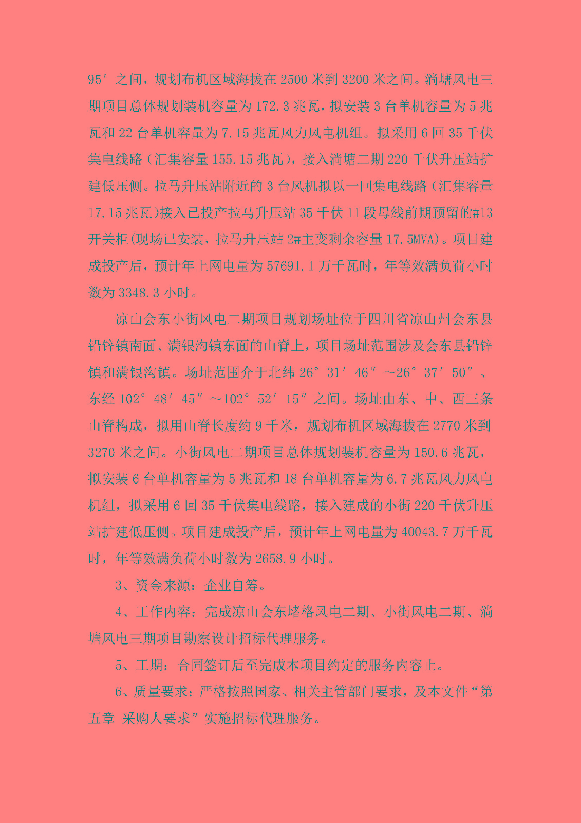 4、工作内容:完成凉山会东堵格风电二期、小街风电二期、淌塘风电三期项目勘察设计招标代理服务。
