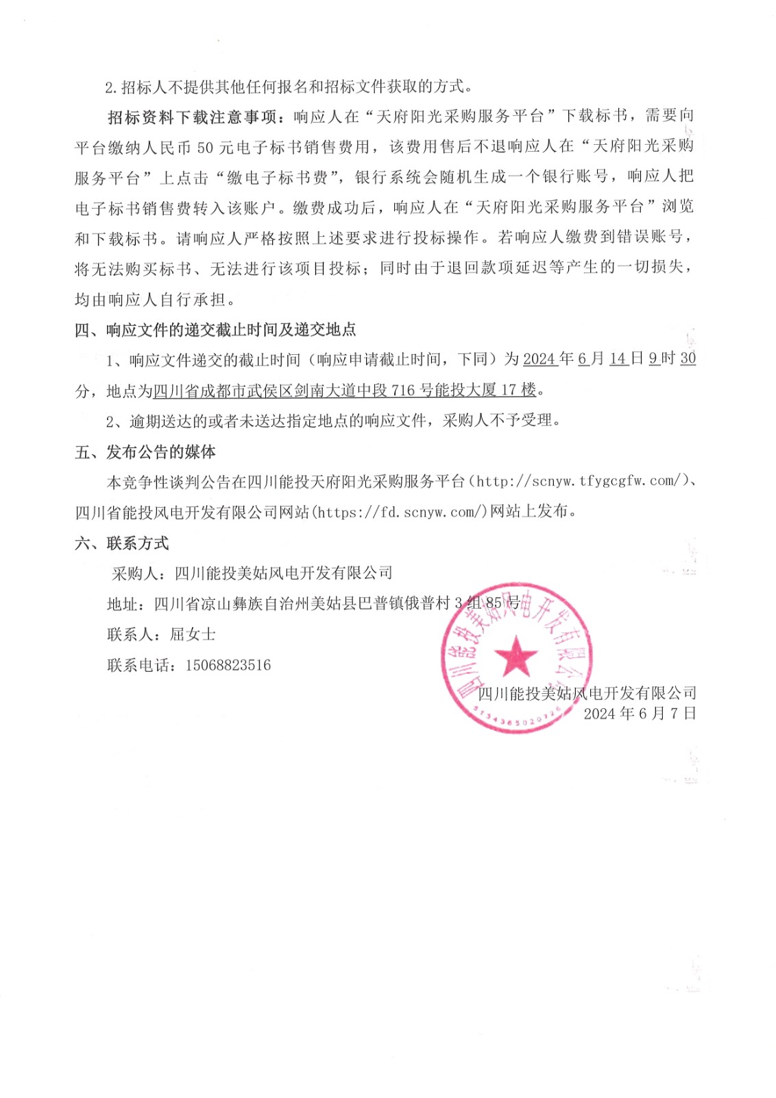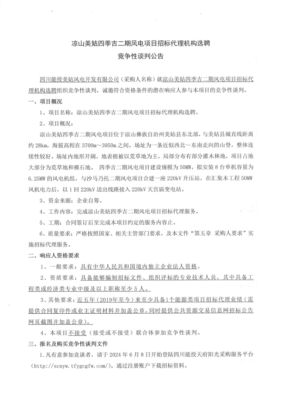 四川能投美姑风电开发有限公司(采购人名称)就凉山美姑四季吉二期风电项目招标代理机构选聘组织竞争性谈判,诚邀符合资格条件的潜在响应人参与本项目的竞争性谈判。