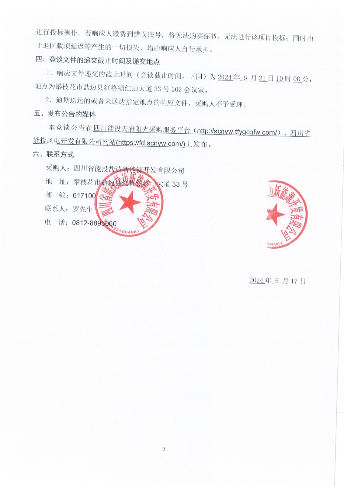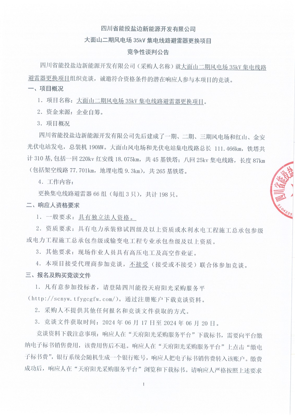 四川省能投盐边新能源开发有限公司(采购人名称)就大面山二期风电场35kV集电线路避雷器更换项目组织竞谈,诚邀符合资格条件的潜在响应人参与本项目的竞谈。