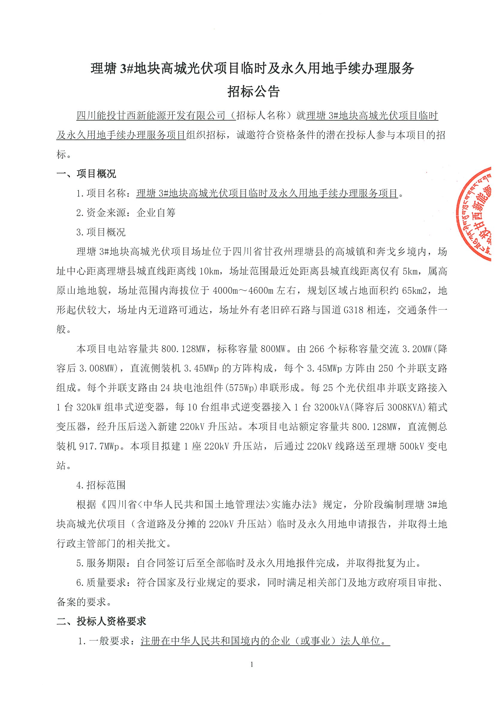 四川能投甘西新能源开发有限公司(招标人名称)就理塘3#地块高城光伏项目临时及永久用地手续办理服务项目组织招标,诚邀符合资格条件的潜在投标人参与本项目的招标。