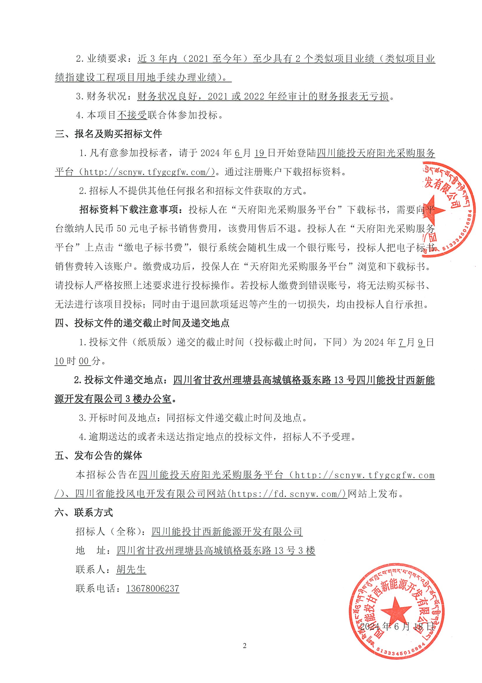 2.投标文件递交地点:四川省甘孜州理塘县高城镇格聂东路13号四川能投甘西新能源开发有限公司3楼办公室。