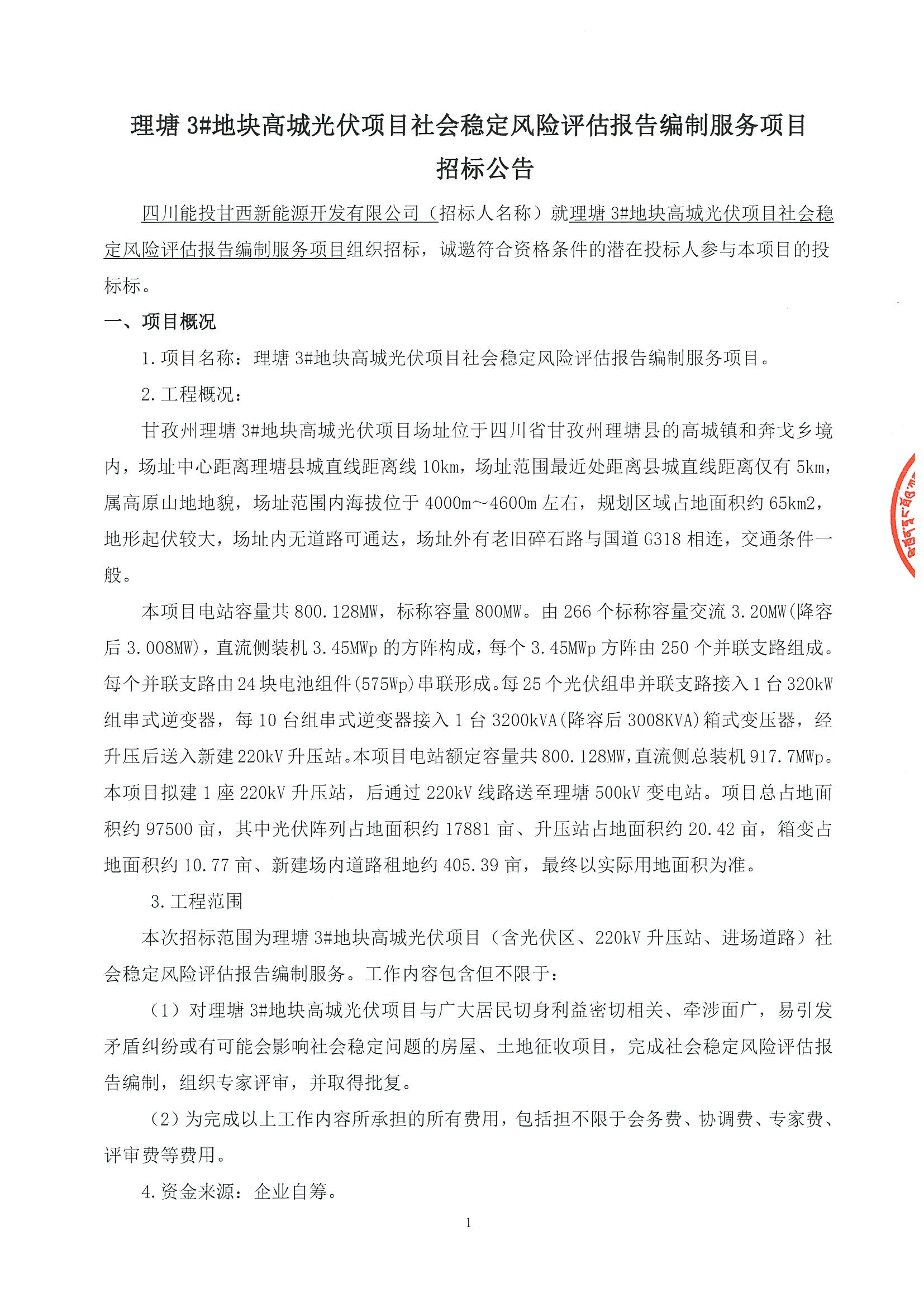 四川能投甘西新能源开发有限公司(招标人名称)就理塘3#地块高城光伏项目社会稳定风险评估报告编制服务项目组织招标,诚邀符合资格条件的潜在投标人参与本项目的投标标。