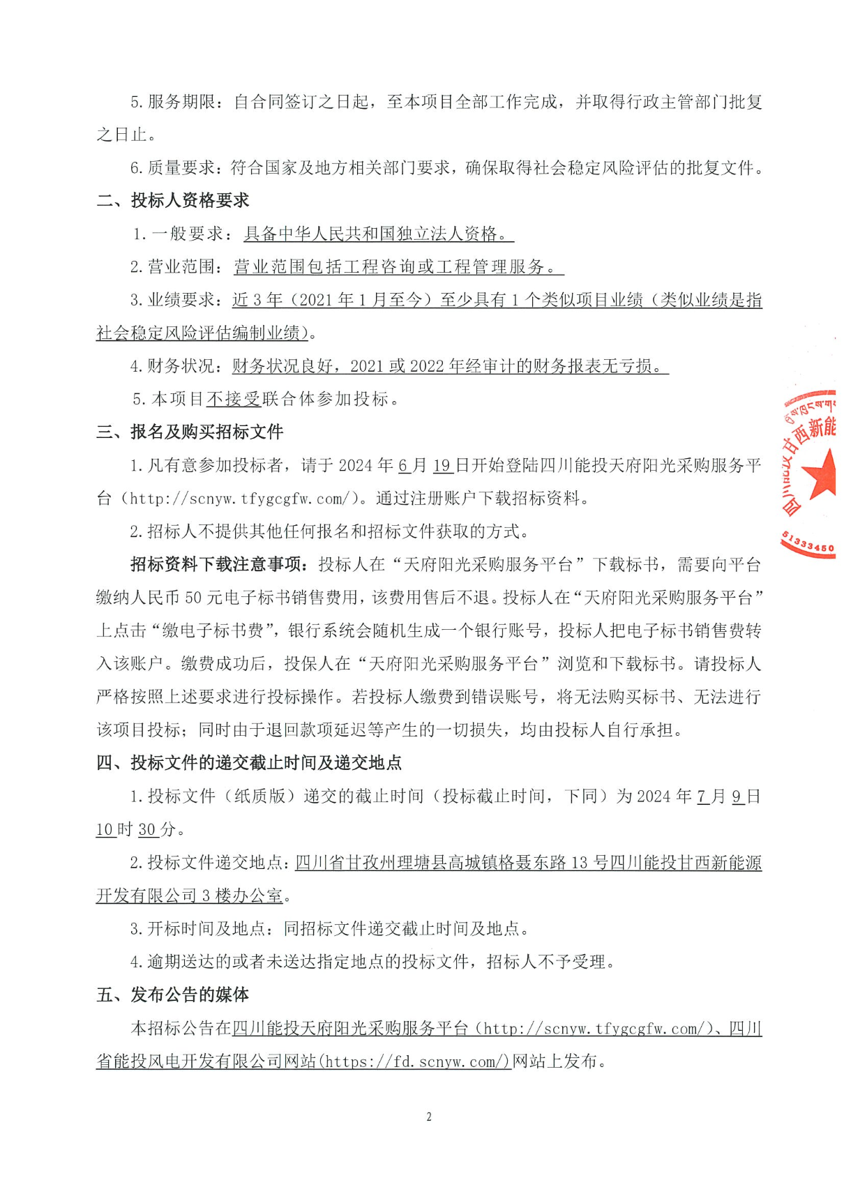 2.投标文件递交地点:四川省甘孜州理塘县高城镇格聂东路13号四川能投甘西新能源开发有限公司3楼办公室。