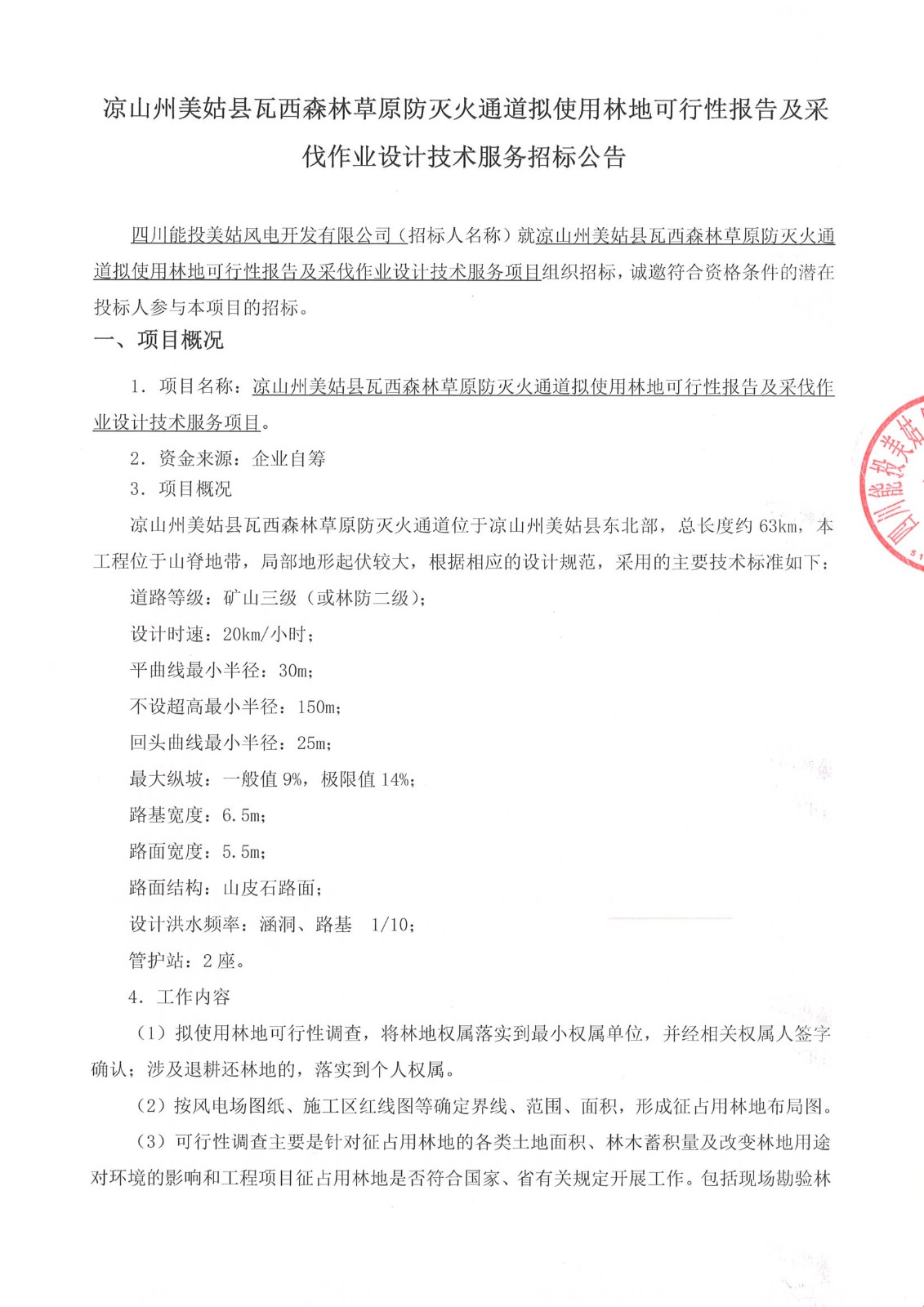 四川能投美姑风电开发有限公司(招标人名称)就凉山州美姑县瓦西森林草原防灭火通道拟使用林地可行性报告及采伐作业设计技术服务项目组织招标,诚邀符合资格条件的潜在投标人参与本项目的招标。