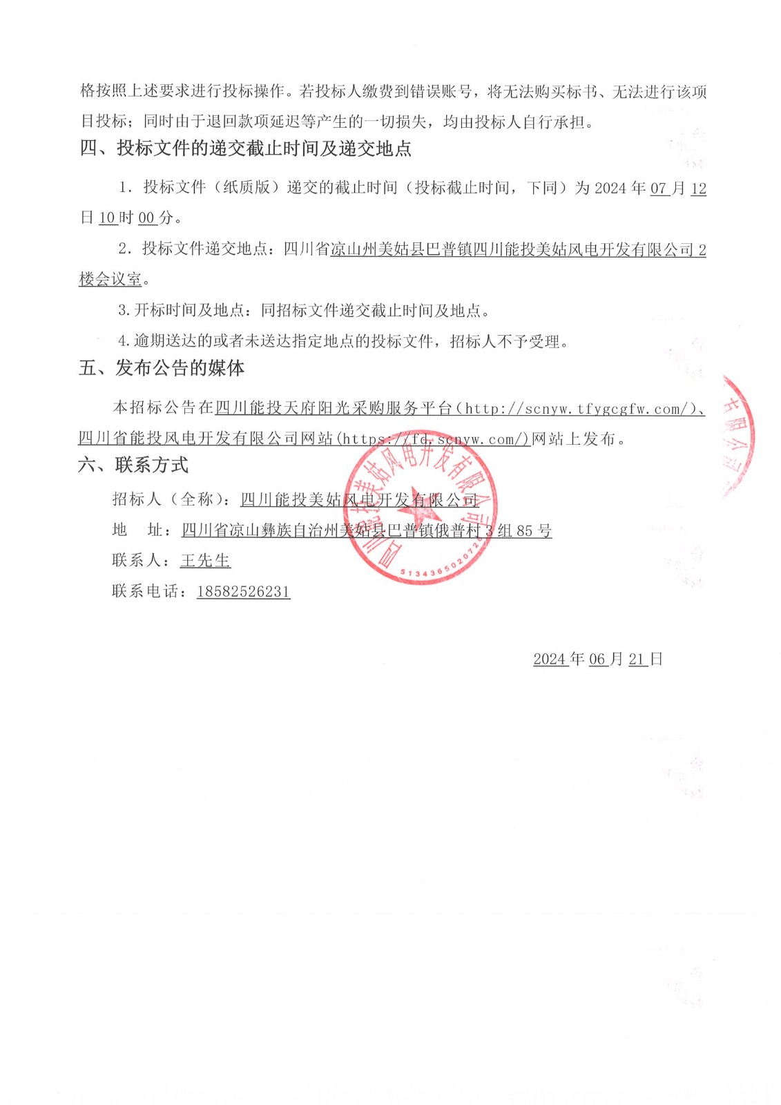 2.投标文件递交地点:四川省凉山州美姑县巴普镇四川能投美姑风电开发有限公司2楼会议室。