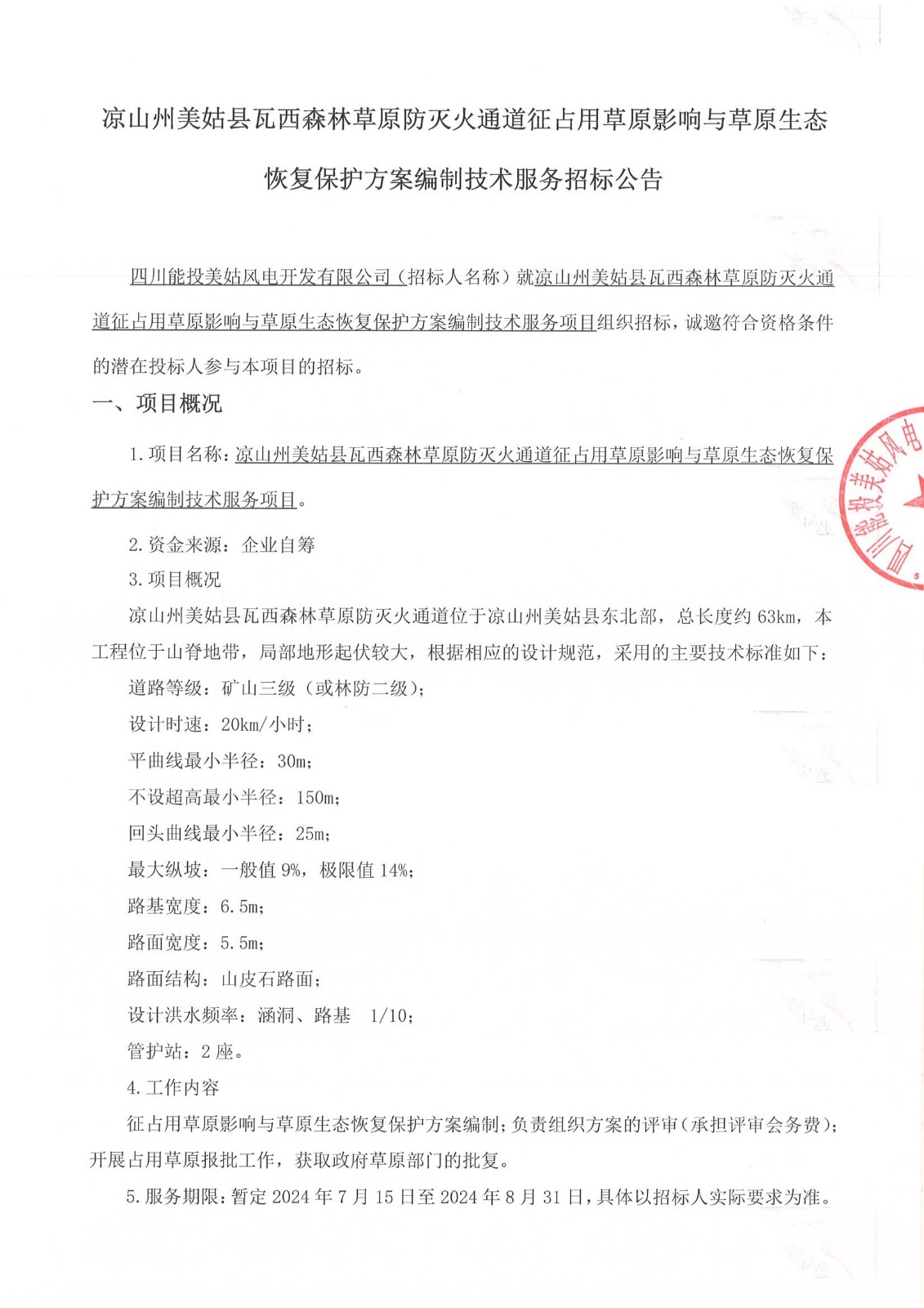 四川能投美姑风电开发有限公司(招标人名称)就凉山州美姑县瓦西森林草原防灭火通道征占用草原影响与草原生态恢复保护方案编制技术服务项目组织招标,诚邀符合资格条件的潜在投标人参与本项目的招标。