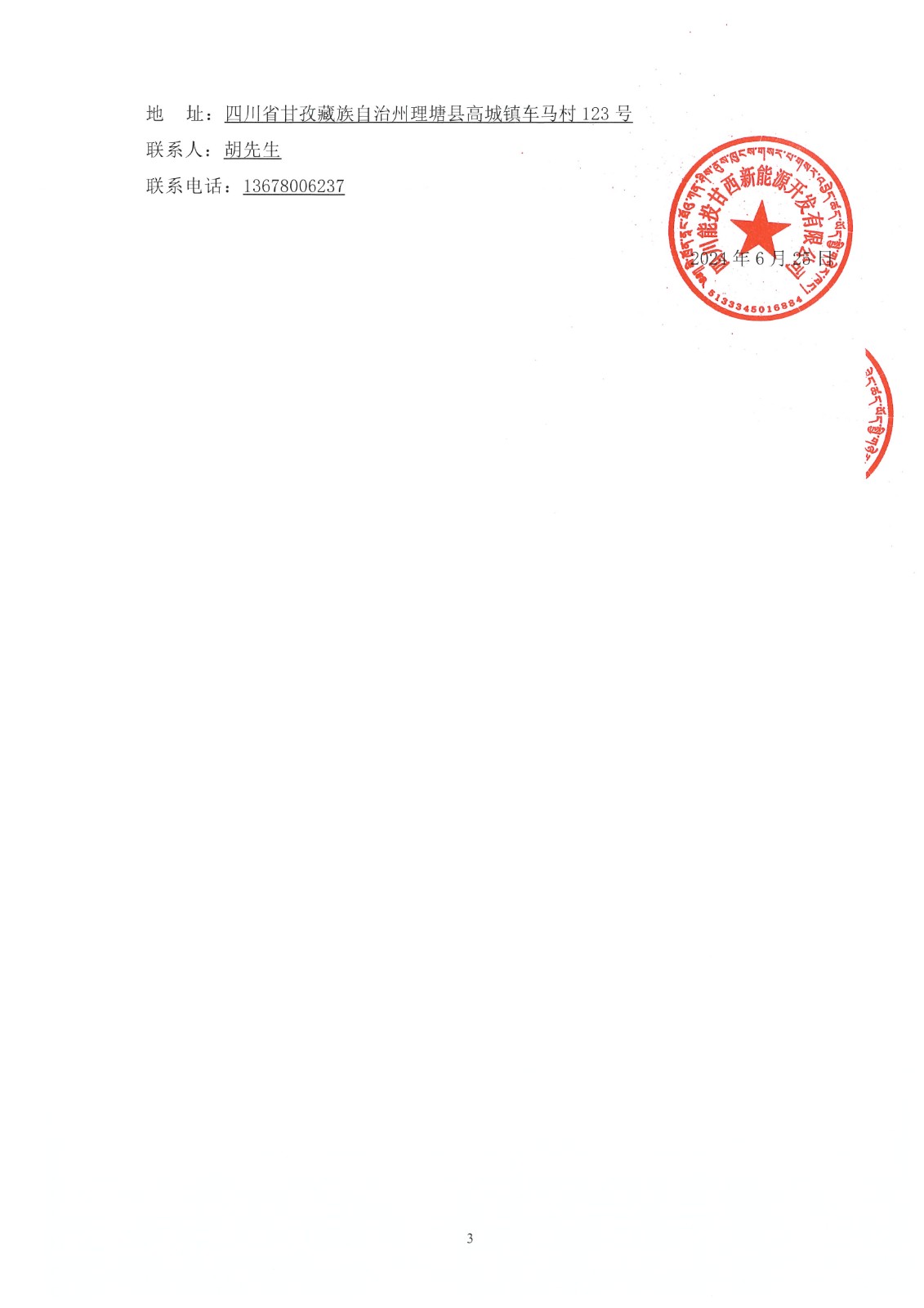 2.投标文件递交地点:四川省甘孜州理塘县高城镇格聂东路13号四川能投甘西新能源开发有限公司3楼办公室。
