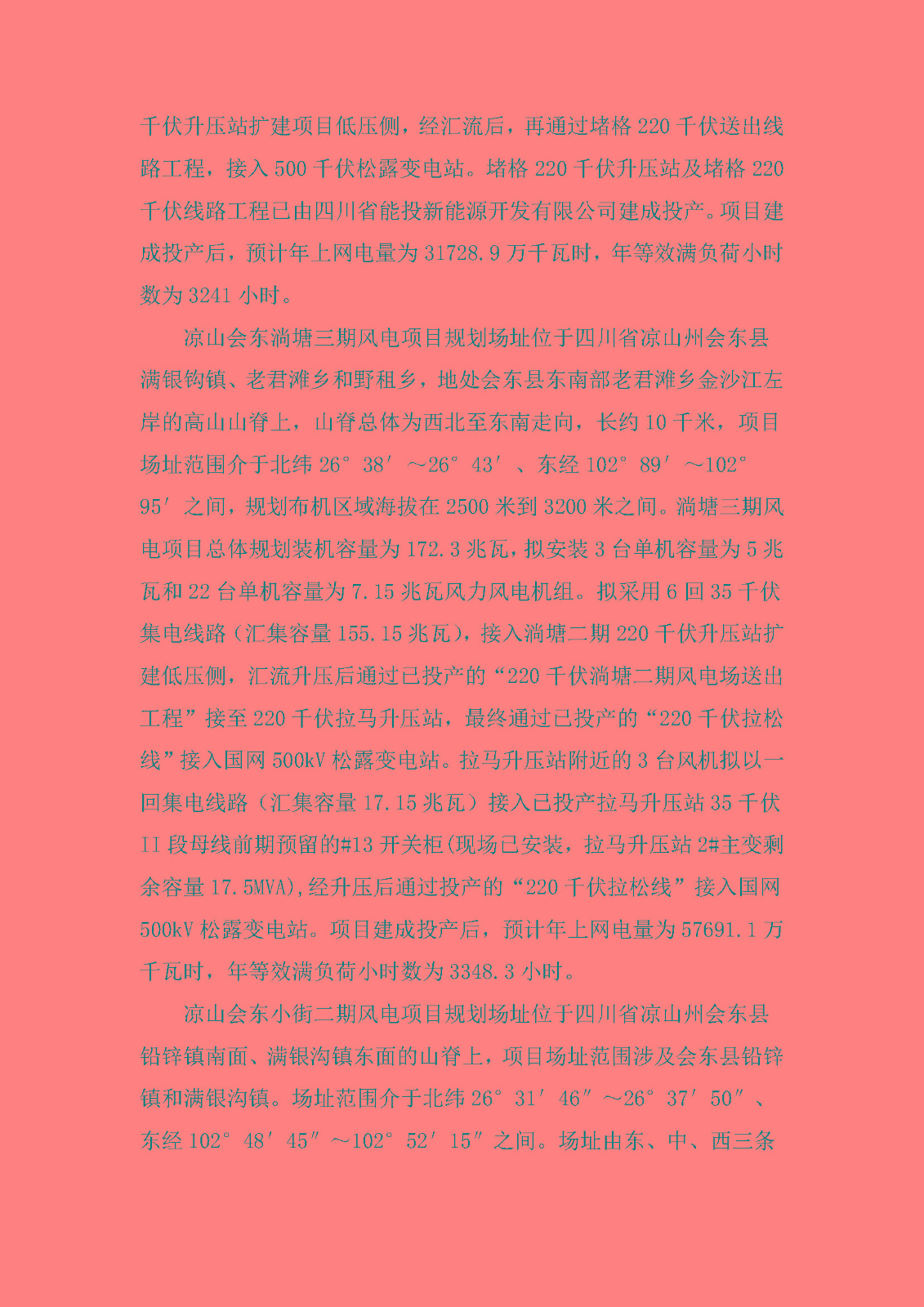 凉山会东堵格二期风电项目场址位于四川省凉山州会东县堵格镇北部,场址范围介于北纬26°46′~26°52′、东经102°37′~102°41′之间。风电场规划利用已建成的堵格一期风电场西片区和淌塘风电场场区范围内剩余机位,规划场址大致分为南北两个片区,北片区位于会东县堵格镇戚家湾村北部与宁南县县界一带一条西北-东南走向的山脊,拟用山脊长度约2千米、划场址涉及面积约3平方千米,规划布机区域海拔在2717米至2860米之间;南片区位于会东县堵格镇云村北面山脊和顶台地,拟用长度约3千米、划场址涉及面积约10平方千米,规划布机区域海拔在2530米至2790米之间。规划场址涉及会东县堵格镇和新街镇。堵格二期风电项目总体规划装机容量为97.9兆瓦,拟安装11台单机容量为5兆瓦和6台单机容量为7.15兆瓦风力风电机组,拟采用4回35千伏集电线路,接入堵格220千伏升压站扩建项目低压侧,经汇流后,再通过堵格220千伏送出线路工程,接入500千伏松露变电站。堵格220千伏升压站及堵格220千伏线路工程已由四川省能投新能源开发有限公司建成投产。项目建成投产后,预计年上网电量为31728.9万千瓦时,年等效满负荷小时数为3241小时。