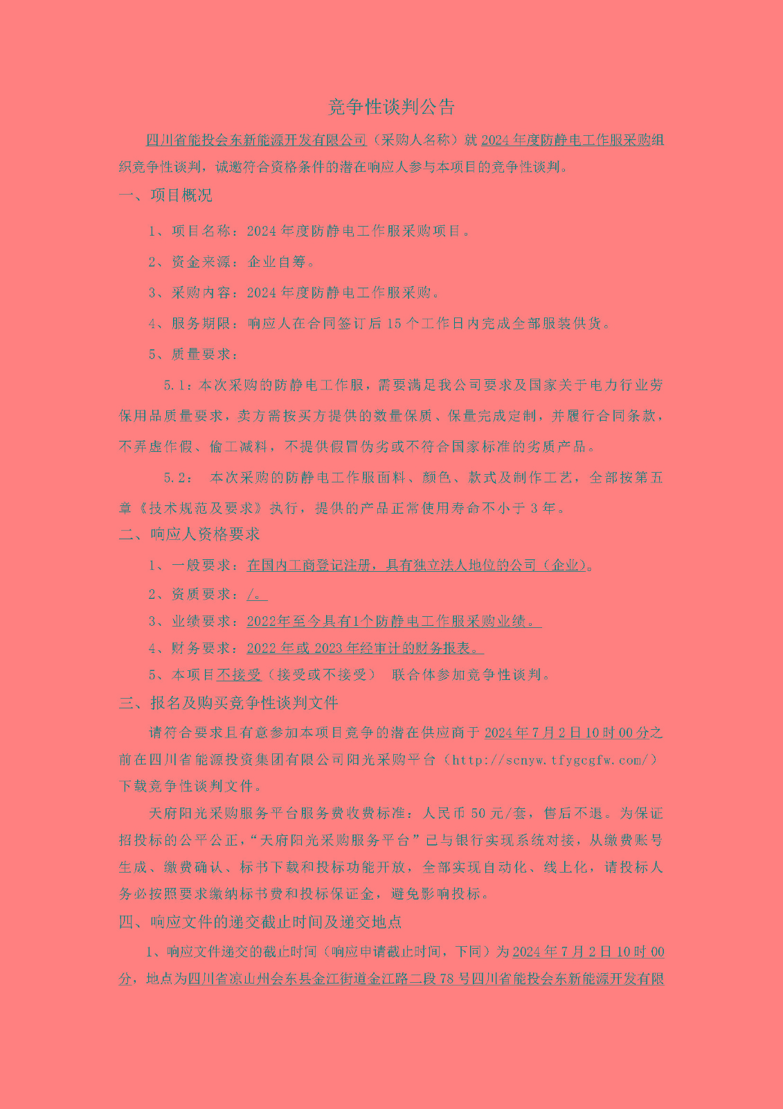 四川省能投会东新能源开发有限公司(采购人名称)就2024年度防静电工作服采购组织竞争性谈判,诚邀符合资格条件的潜在响应人参与本项目的竞争性谈判。