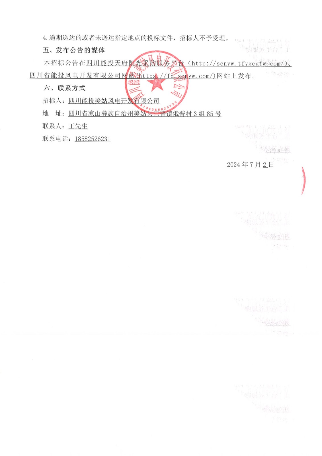 2.投标文件递交地点:四川省凉山州美姑县巴普镇四川能投美姑风电开发有限公司2楼会议室。