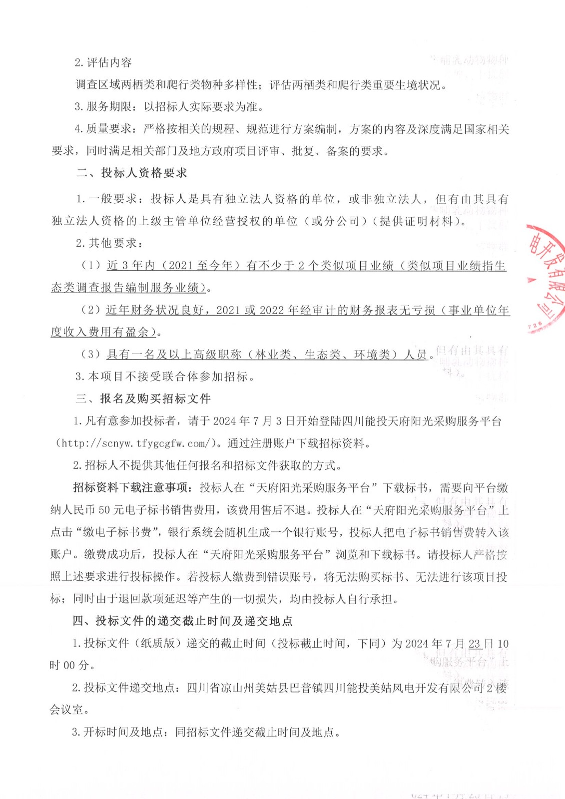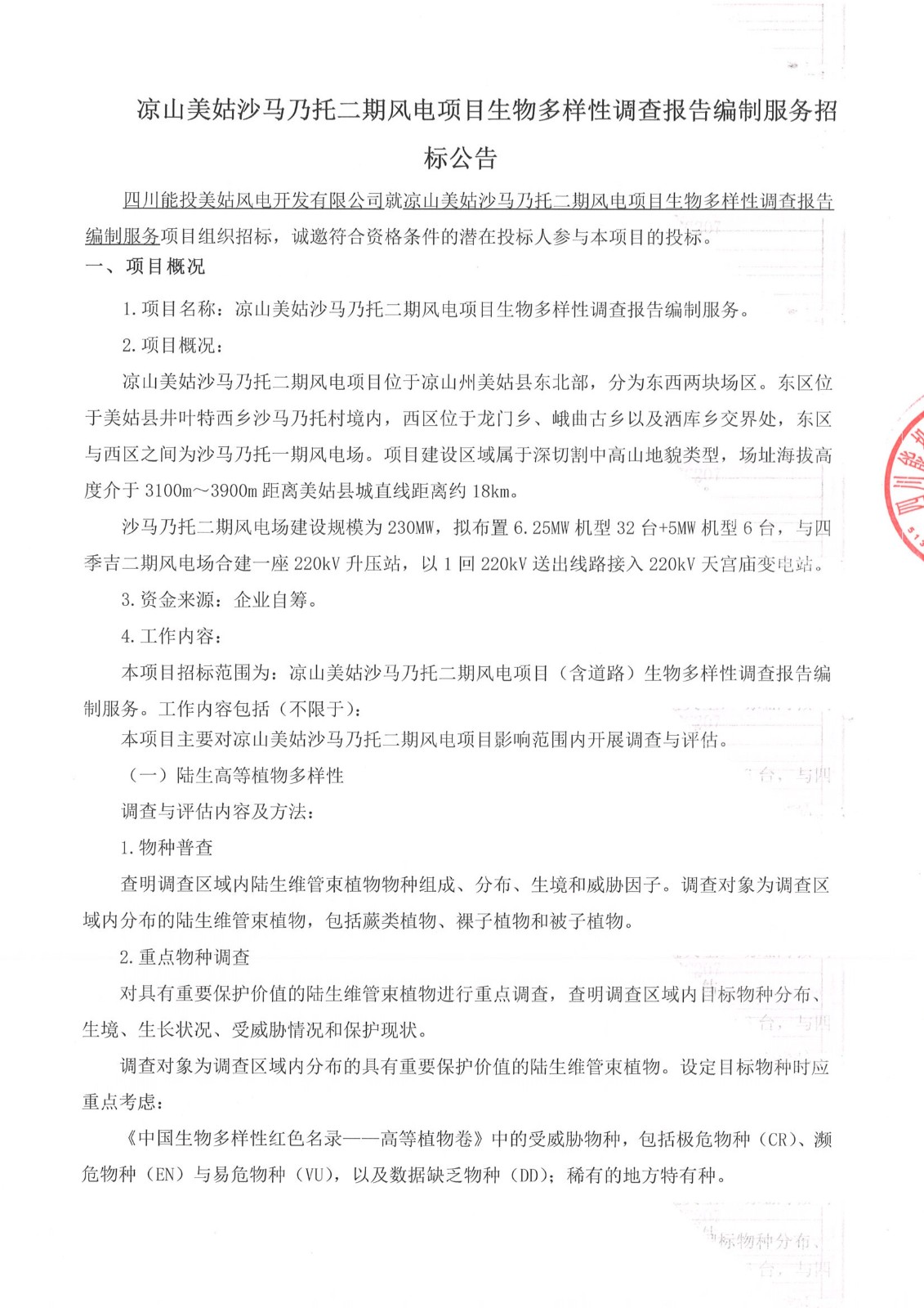 四川能投美姑风电开发有限公司就凉山美姑沙马乃托二期风电项目生物多样性调查报告编制服务项目组织招标,诚邀符合资格条件的潜在投标人参与本项目的投标。