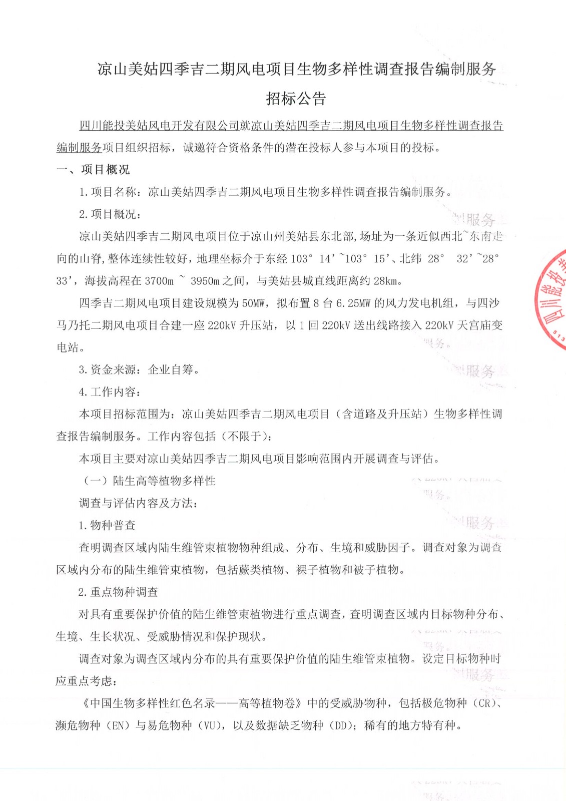 四川能投美姑风电开发有限公司就凉山美姑四季吉二期风电项目生物多样性调查报告编制服务项目组织招标,诚邀符合资格条件的潜在投标人参与本项目的投标。