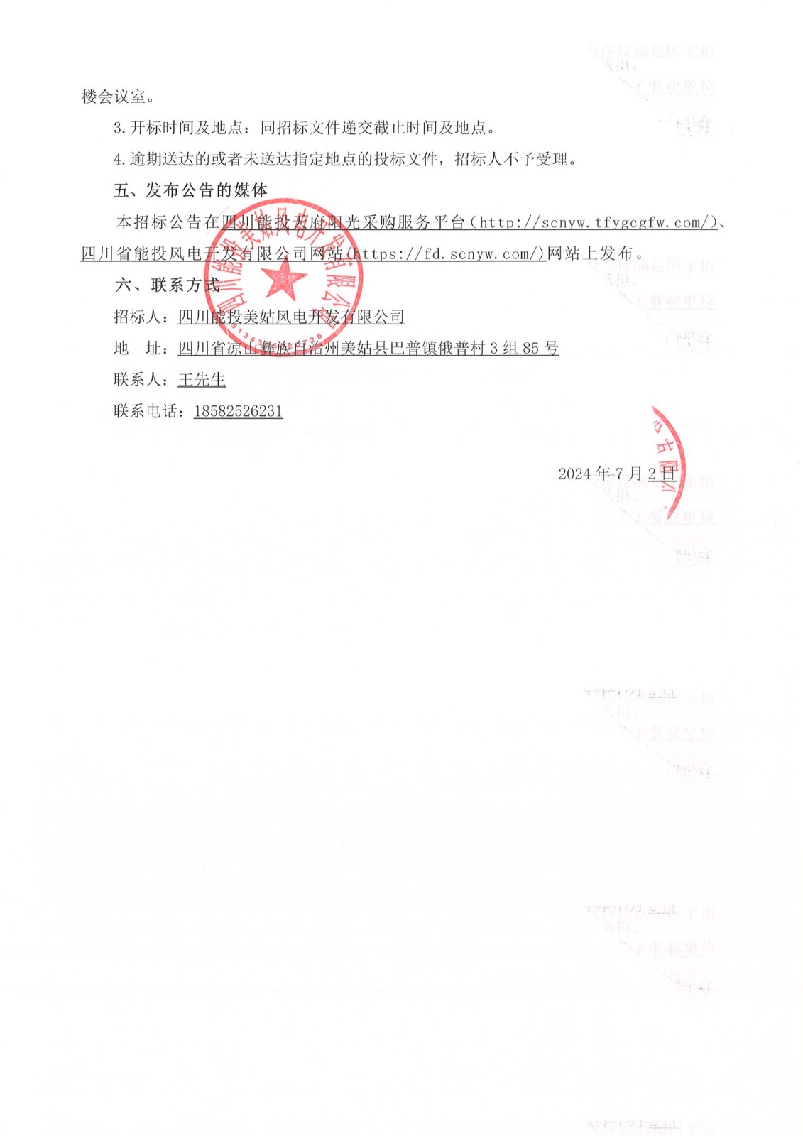 2.投标文件递交地点:四川省凉山州美姑县巴普镇四川能投美姑风电开发有限公司2楼会议室。