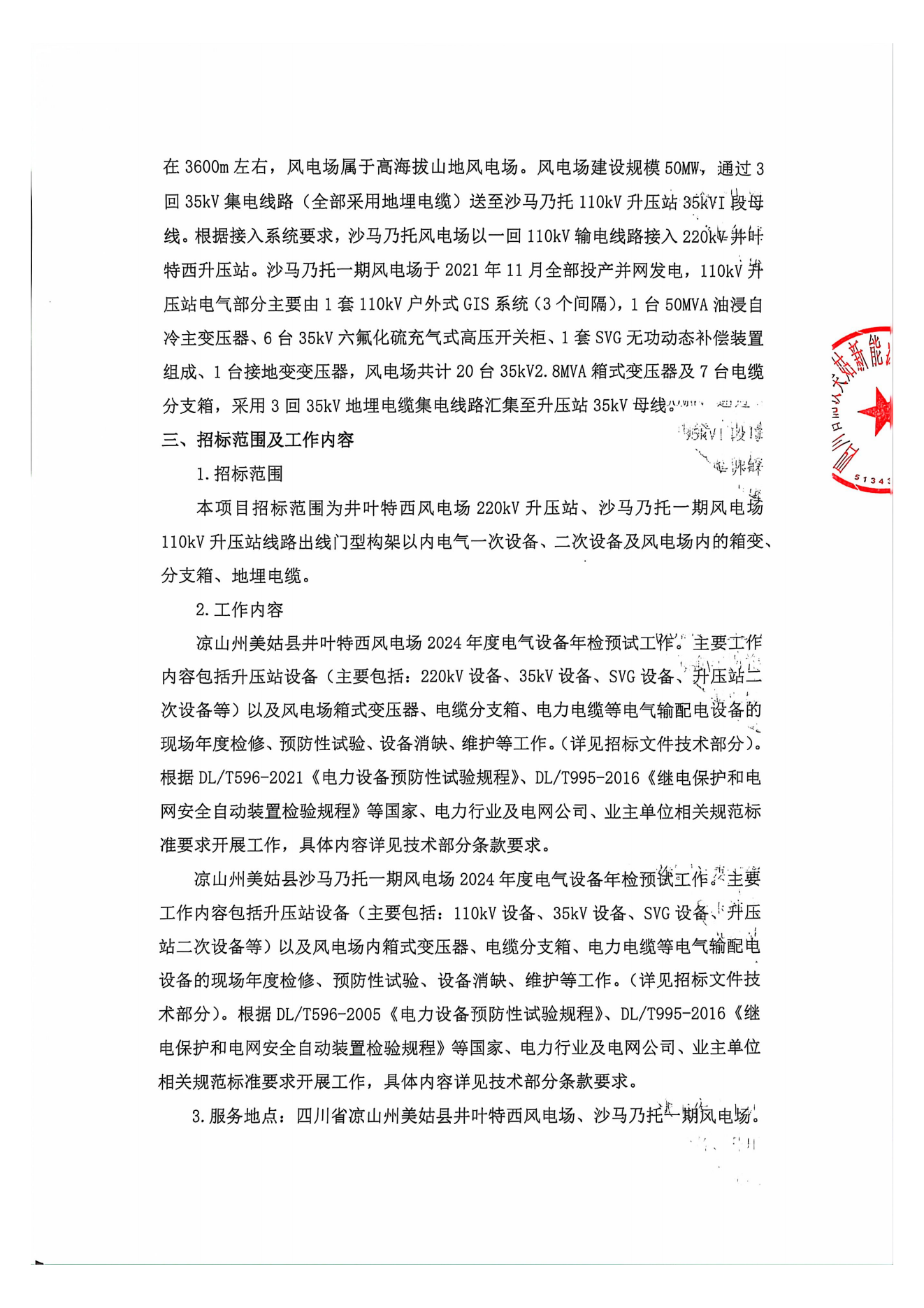 凉山州美姑县井叶特西风电场2024年度电气设备年检预试工作。主要工作内容包括升压站设备(主要包括:220kV设备、35kV设备、SVG设备、升压站二次设备等)以及风电场箱式变压器、电缆分支箱、电力电缆等电气输配电设备的现场年度检修、预防性试验、设备消缺、维护等工作。(详见招标文件技术部分)。根据DL/T596-2021《电力设备预防性试验规程》、DL/T995-2016《继电保护和电网安全自动装置检验规程》等国家、电力行业及电网公司、业主单位相关规范标准要求开展工作,具体内容详见技术部分条款要求。