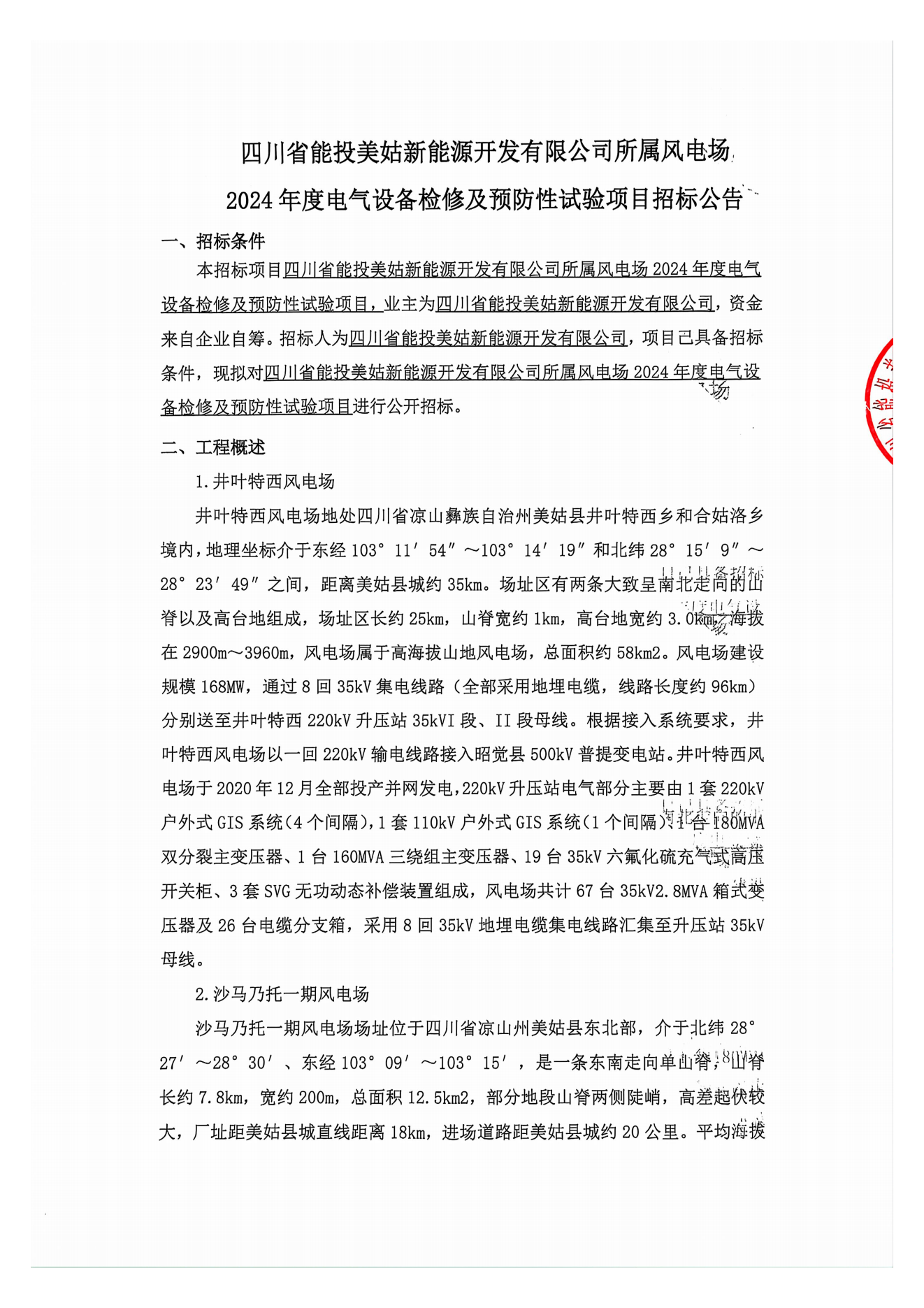 本招标项目四川省能投美姑新能源开发有限公司所属风电场2024年度电气设备检修及预防性试验项目,业主为四川省能投美姑新能源开发有限公司,资金来自企业自筹。招标人为四川省能投美姑新能源开发有限公司,项目己具备招标条件,现拟对四川省能投美姑新能源开发有限公司所属风电场2024年度电气设备检修及预防性试验项目进行公开招标。