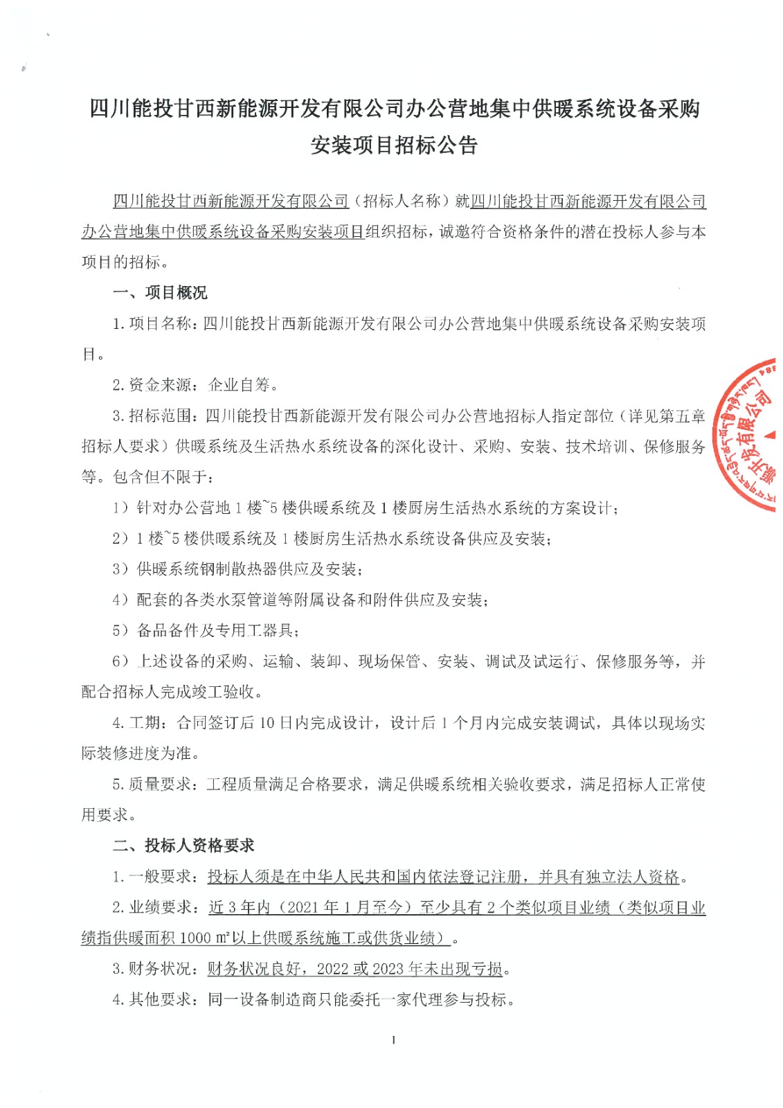 四川能投甘西新能源开发有限公司(招标人名称)就四川能投甘西新能源开发有限公司办公营地集中供暖系统设备采购安装项目组织招标,诚邀符合资格条件的潜在投标人参与本项目的招标。