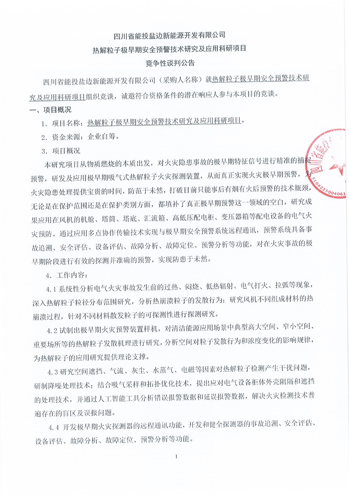 四川省能投盐边新能源开发有限公司(采购人名称)就热解粒子极早期安全预警技术研究及应用科研项目组织竞谈,诚邀符合资格条件的潜在响应人参与本项目的竞谈。